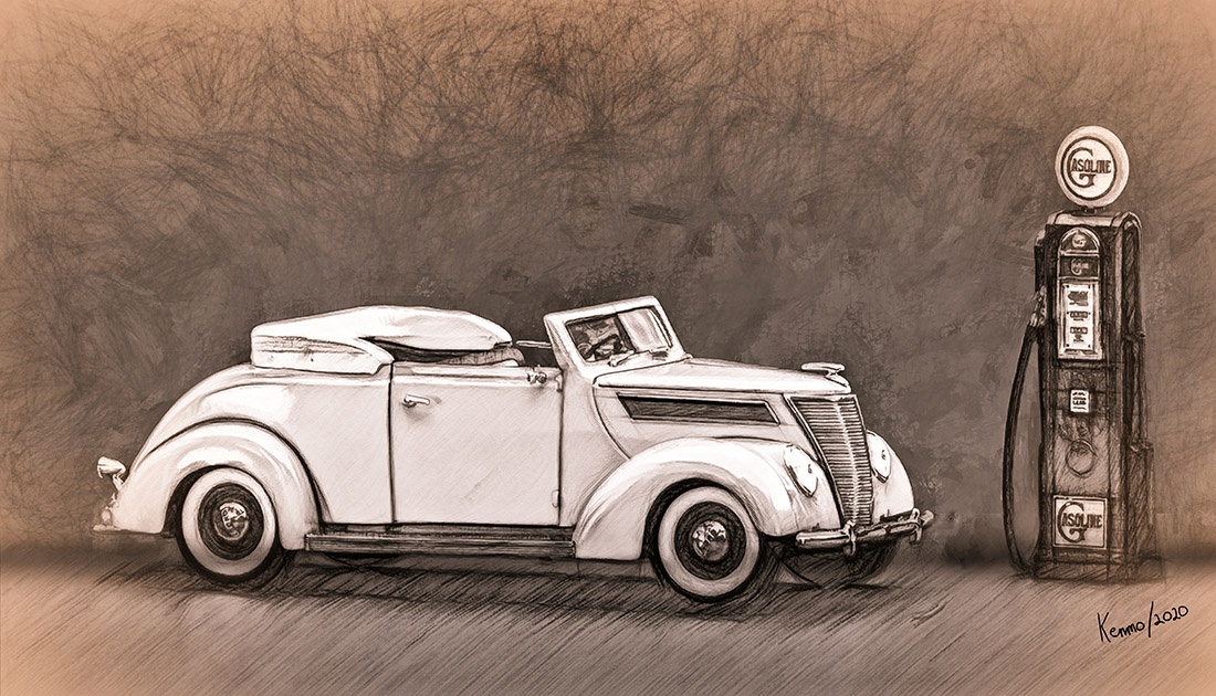 And the digital sketch of a 1937 Ford convertible and gas pump. Sketched digitally using Wacom Intuos tablet & pen, Photoshop CC 2020, Topaz Studio 2 & Filter Forge 9.