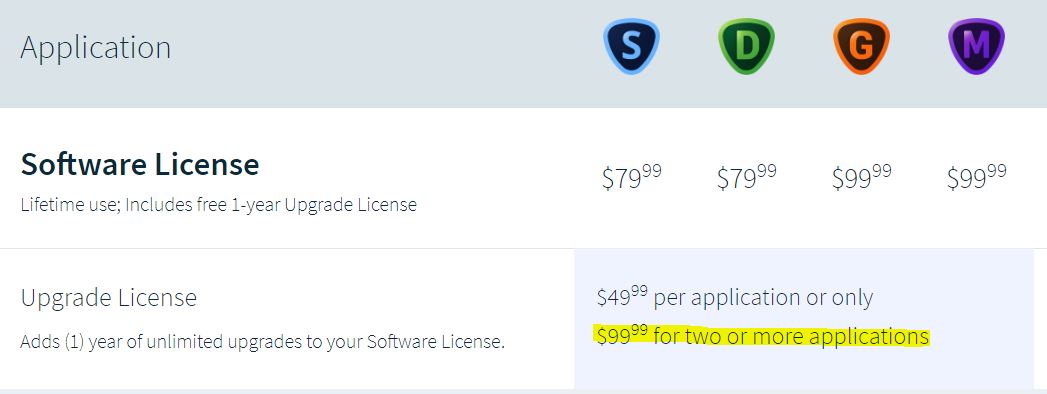 Which 4 products? Only Sharpen AI has bugged me about upgrading. Also, where did you see the $99 for 4? (And I’m wondering why Sharpen AI’s upgrade dialog box said nothing about 4 for $99.)