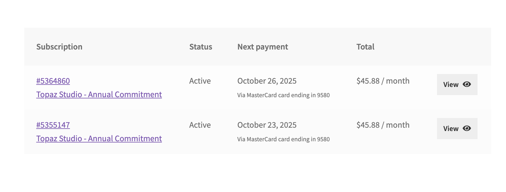 I currently have two active Topaz Studio Annual subscriptions (screenshots attached).