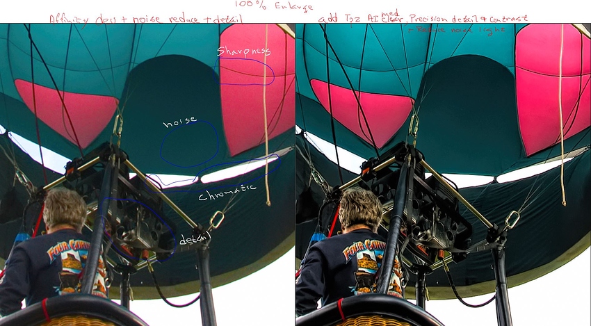AI Clear may not solve every problem and I have used Reduce Noise after it on some pictures but it also shines in other areas such as sharpness, pulling out detail (even from dark areas) and reducing or eliminating chromatic aberrations. Here are two comparisons. In the balloon image, I first processed in Affinity (similar to Photoshop) and then processed (in addition) in Studio using AI Clear and lightly with Precision Detail, Contrast and Reduce Noise (I know they tell you not to pre-process the image but it still works if not overdone). I have circled example areas in blue.