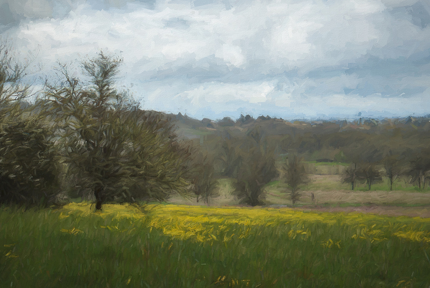 “And the Rain, Wind and Hail Came” Lizzie and I started our hike today in the Bald Hill Farm, heading for the Mulkey Ck Bridge. As we began, it was sprinkling a bit, combined with strong winds. Soon the sun came out. As we approached the bridge, the sky turn super dark. Shortly on the way back, a driving rain started (the front of my pants were bone dry; the back was sopping wet). And then, the hail began. It was quite an adventure! (This image was shot in the pouring rain.) The painterly look was created with Impression, Degas Dancers (inside of Studio)