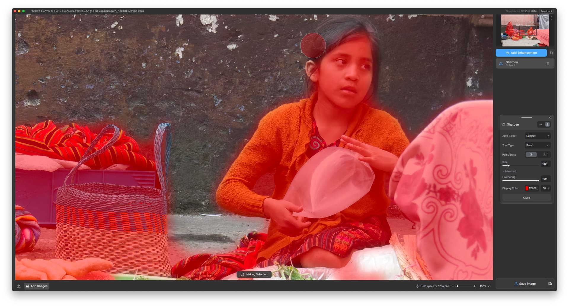 Then click on the little person icon in the Sharpen panel and you will see what the AI has selected highlighted in red. If you wish to modify then use one of the brushes to add to or remove from the selection: