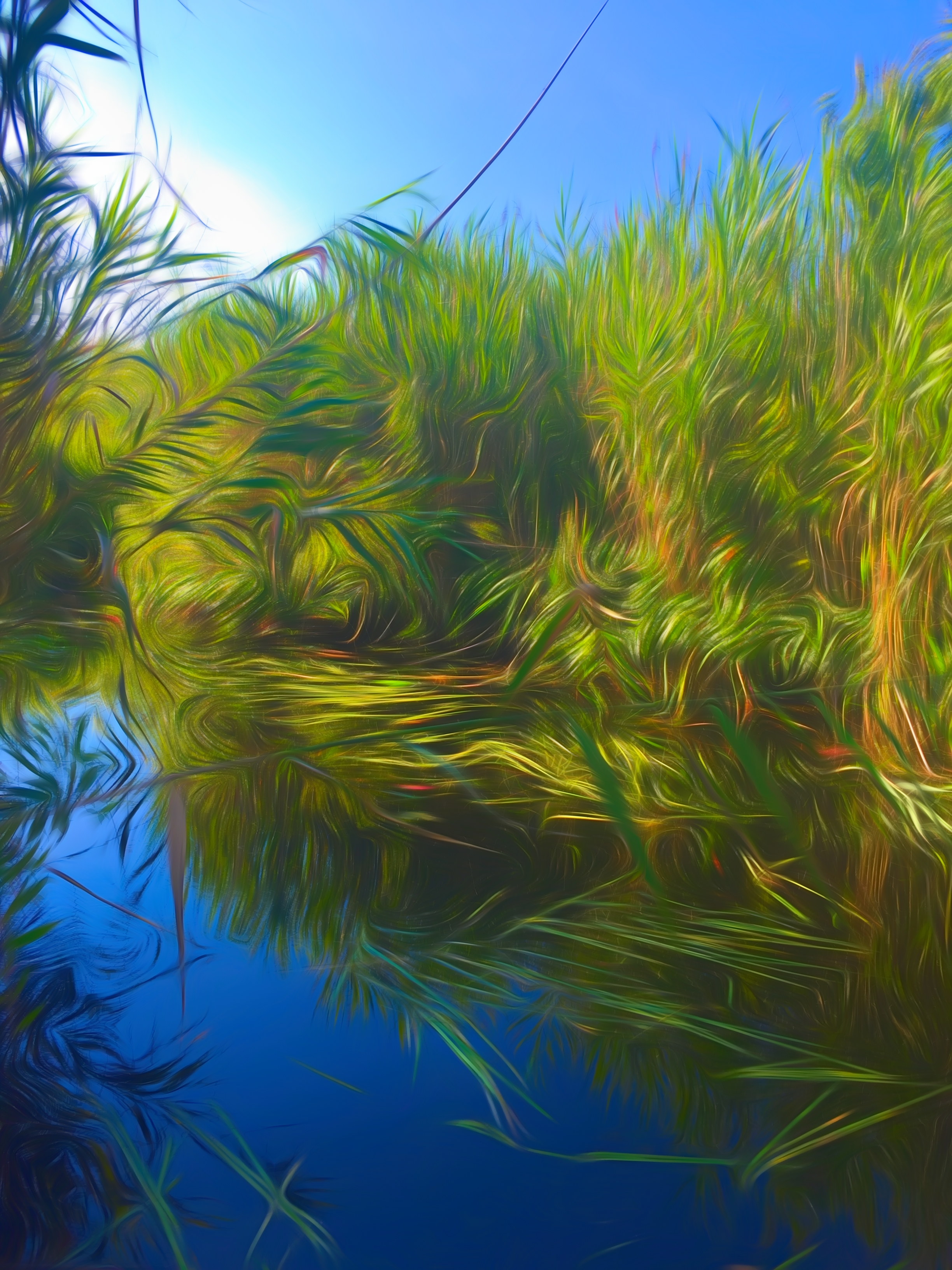 Love the deep blue of the water against the yellow/green vegetation.