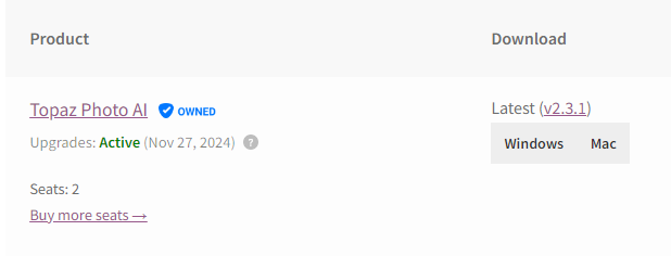 Okay, glad to hear it is working. My Gigapixel AI year expired and I don’t really care much about getting it renewed since Photo AI includes the uprez also. My Photo AI expires in November 2024. I suppose there is no way to use the 72CASH to extend it to November 2025, right? I cannot see a way. Too bad. If I can do that I would gladly pay the $79 - 72 = $7. ![]()