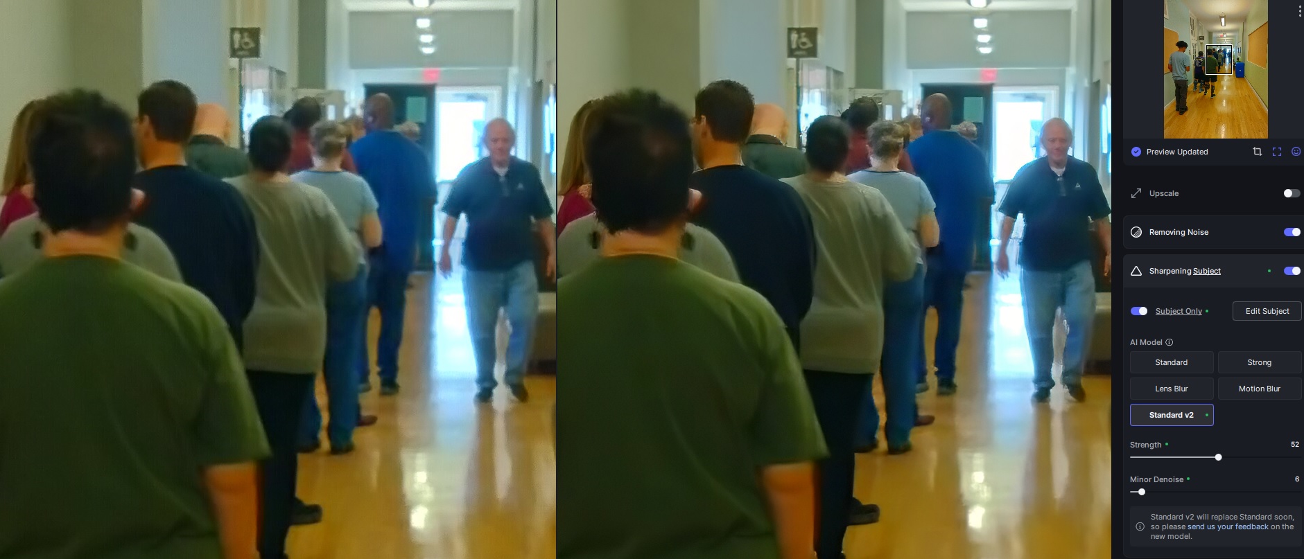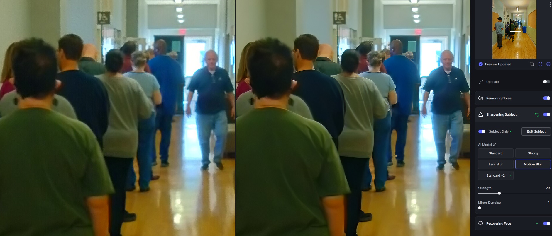 I ran a smartphone photo I shot at my polling station this afternoon through Topaz Photo AI. It autoselected Sharpen V2 and Face Recovery filters. I’m not happy about the extra line around the man walking up the hall. For comparison, I changed the sharpening filter from V2 to Motion Blur. In my opinion, Motion Blur gave better results overall, though still didn’t do much for the backlit man walking up the hall. You can see screenshots I made of the results: