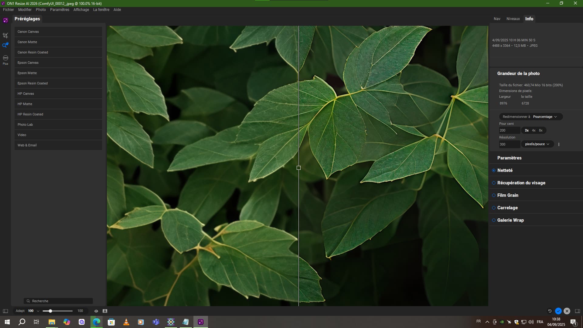 By combining an extra x2 pass in Hypir AI + a variation with Recover v2 + the variation with ON1 and a variation with GAI Standard, I really get something super cool and realistic. Even the leaves, you can see the little veins. It’s … (I don’t even have the words it’s so crazy).