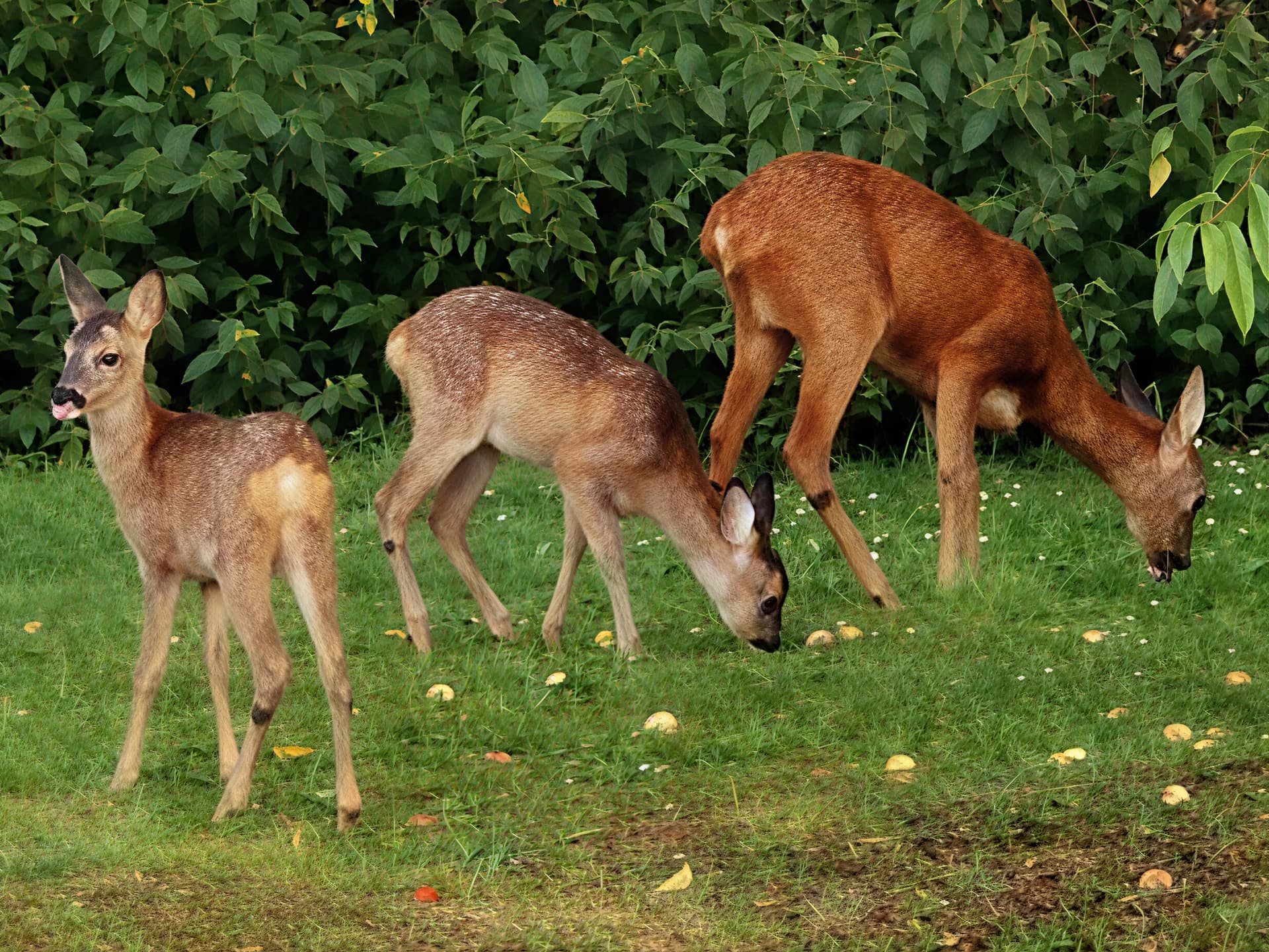 "Enhance this image showing three young roe deer in a garden at dusk. The scene features one roe deer standing alert on the left, looking toward the camera, with its small tongue slightly visible, while two others are grazing on the grass. The ground is covered with green grass and scattered fallen peaches, recognizable by their round shape and yellow-orange color.