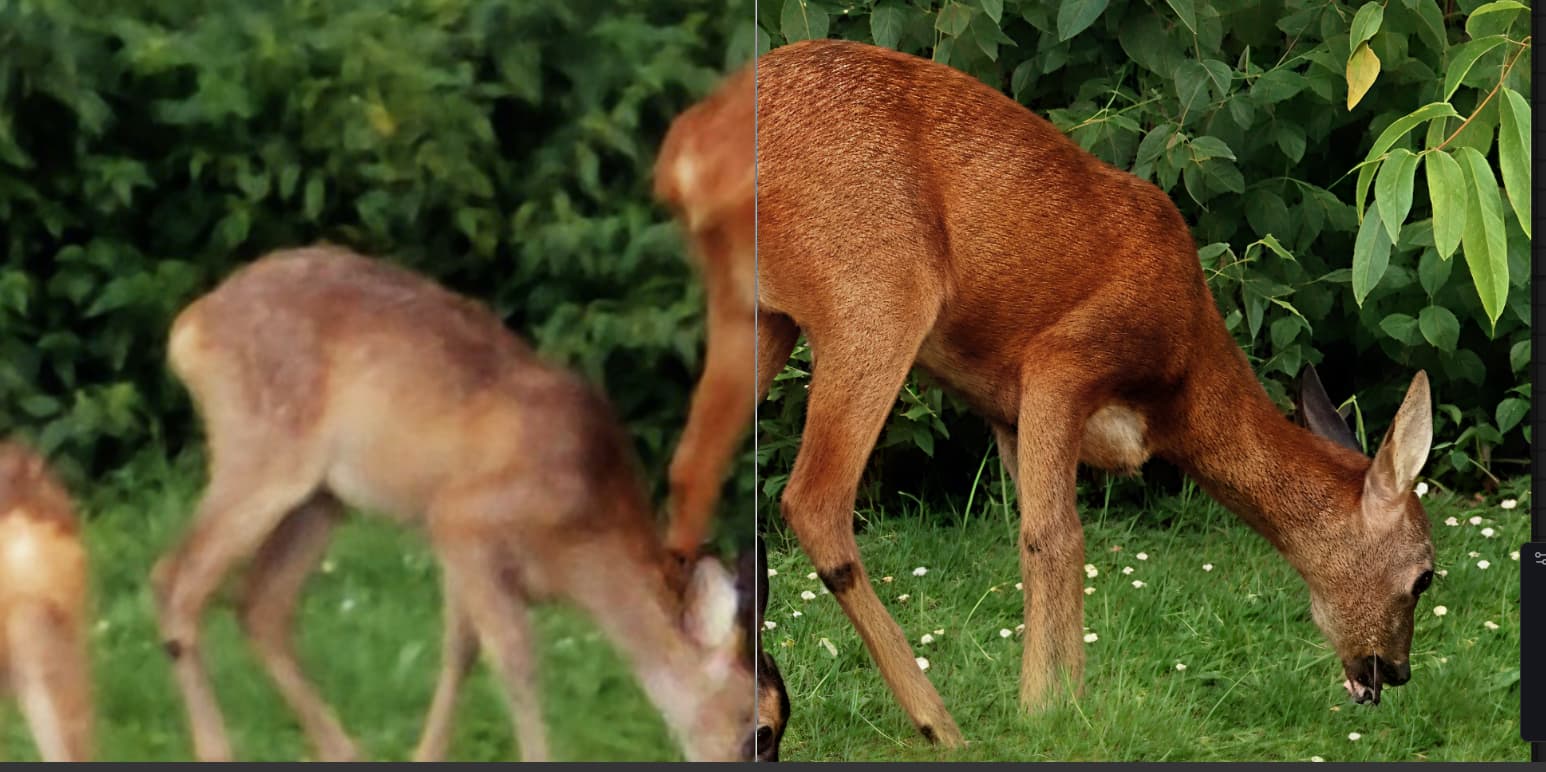 Upscaled x2 directly in Hypir from the first Hypir upgrade. I love the details in the grass, foliage, and on the roes deer. However, the head of the best one is weird. I still need to improve that.