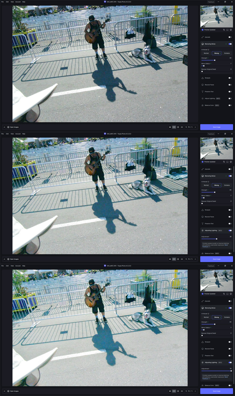 I noticed that denoising and sharpening runs again after “Adjusting Lighting”. This is very good, since both effects have to be reassessed once the lighting is adjusted.