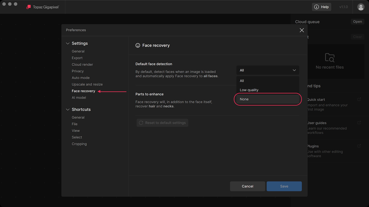 Topaz Gigapixel v1.1.0 was released with a preference to set Face recovery default to None.