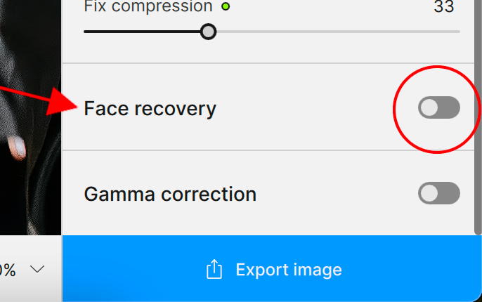 In My description on the other hand, I was referring to the Face Recovery toggle On & Off switch found at the bottom of the control panel to the right of the image preview