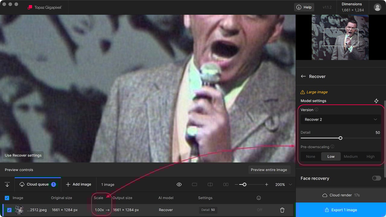 Tip: process a 1x scale factor to the image using Recover v2 and either Low, Medium, or High pre-downscaling applied. After, use that result with another model to upscale. Here is the result with Wonder 2 after that workflow: