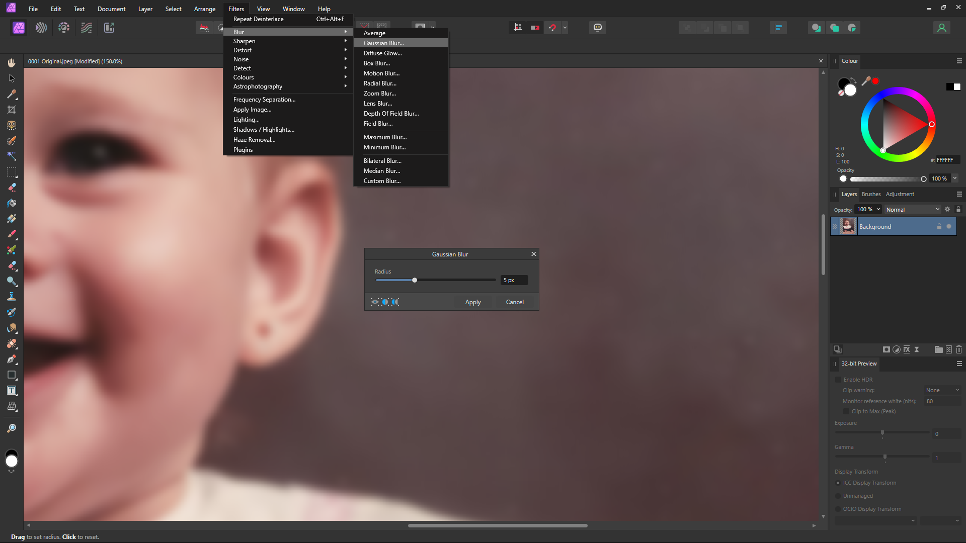 1st: Open the picture of the baby in AFFINITY PHOTO2 and zoom in 150% so that the picture texture is easily visible.
