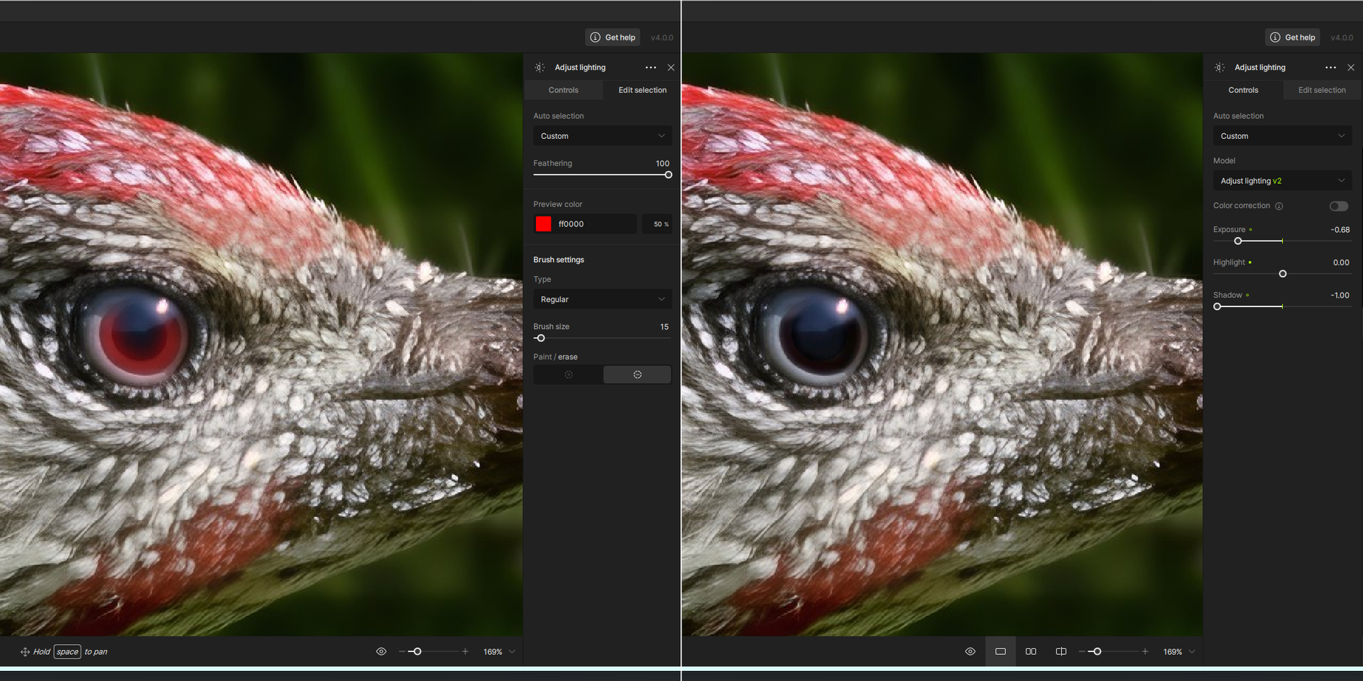 Well, it also seemed to me that there was some reflection of the surroundings in my woodpecker’s eye, maybe the sky above and maybe some bushes or something below, and that bright dot in the upper right of the eye might be the sun… who knows. Ideally, the eye is probably all black, but my bird was chasing ants in the grass about 25-30 meters away from me – so I have no idea what it actually had in that eye. I didn’t like the brown artificially intelligent iris, and the Remove function solved it quite well. I admit that I also searched for photos of woodpeckers on the Internet, but I couldn’t find any nice, large detail, so I ended up solving it in this simple way.