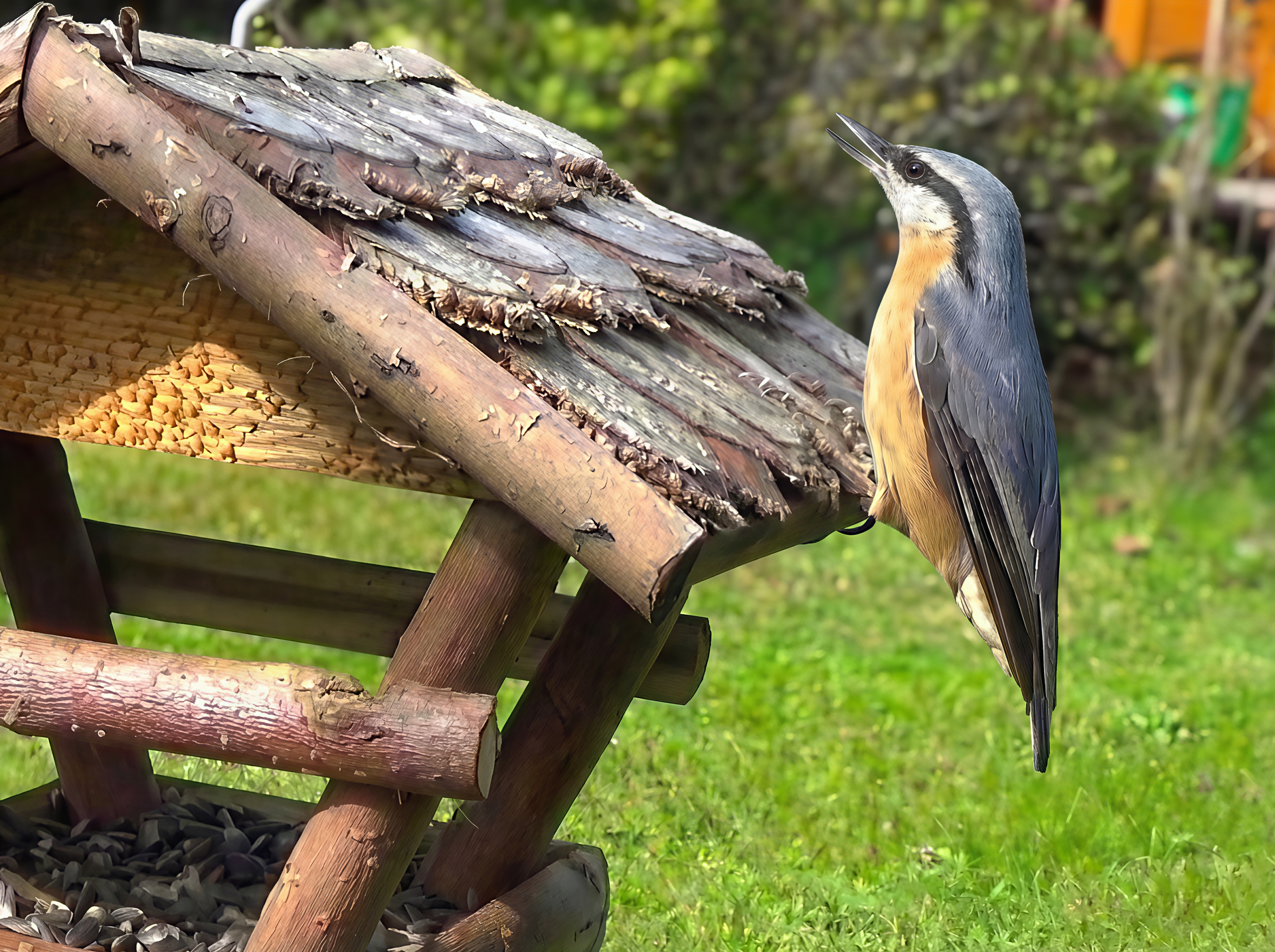 ”Ultra-realistic macro wildlife photograph of a Eurasian Nuthatch (Sitta europaea) perched vertically on the edge of a rustic wooden bird feeder roof. The bird’s profile is sharp, with a pointed beak slightly open towards the sky, slate-grey-blue plumage on its back, a vibrant russet-orange belly, a white throat, and a distinctive black eye stripe. The feather texture is silky and highly detailed.