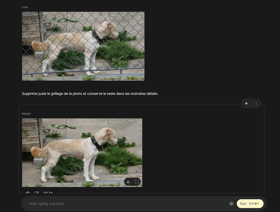 Sometimes the prompt works perfectly. I envied Harald’s lions without bars, so I tried something similar. It’s not a lion, it’s a nice dog that I walk past every summer. The dog watches what’s going on behind the fence and when it gets a toll (the currency is biscuits), it happily allows passage around. I wanted an image without a wire fence, so I tried Gemini and entered just a simple prompt for testing: