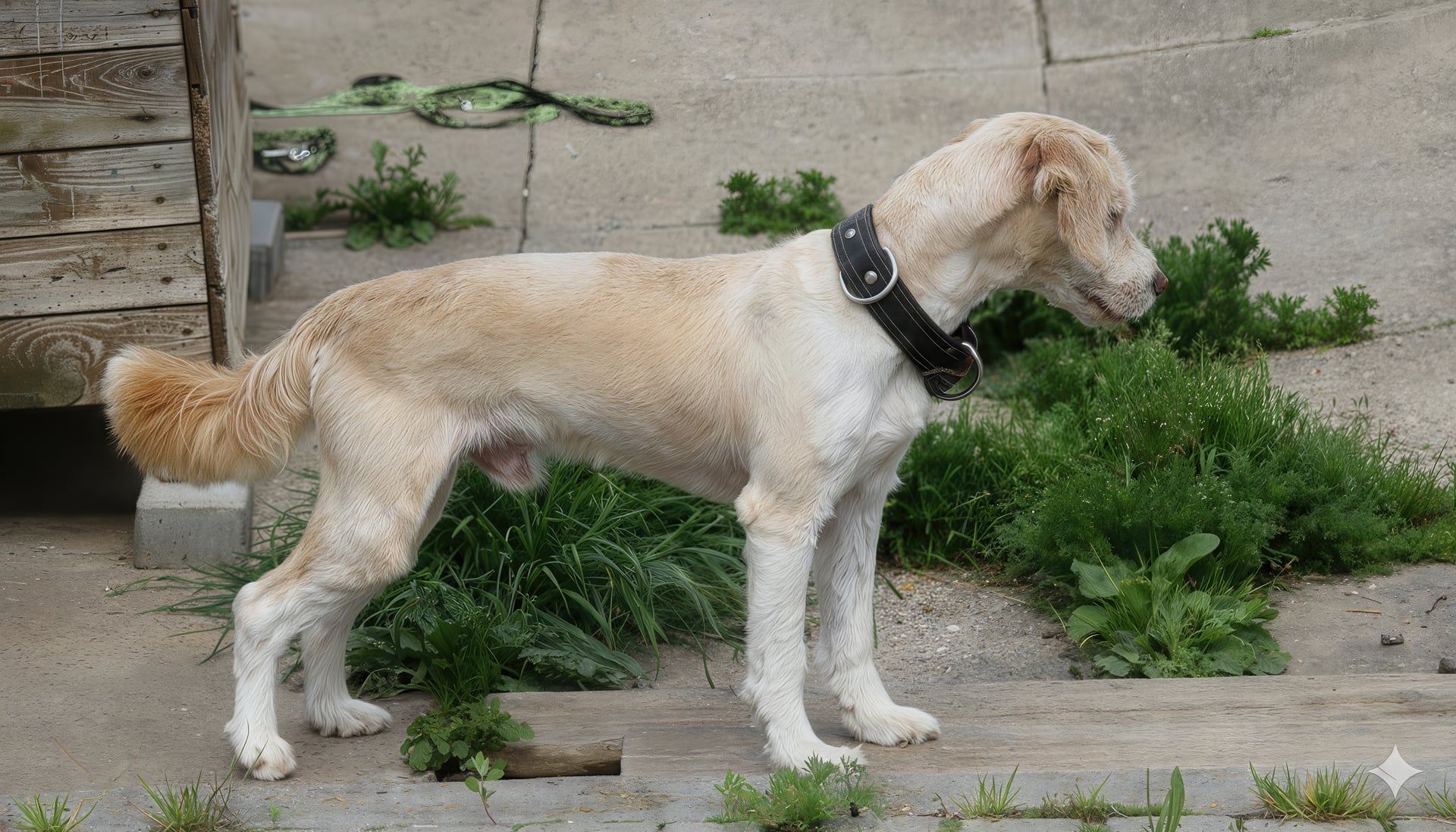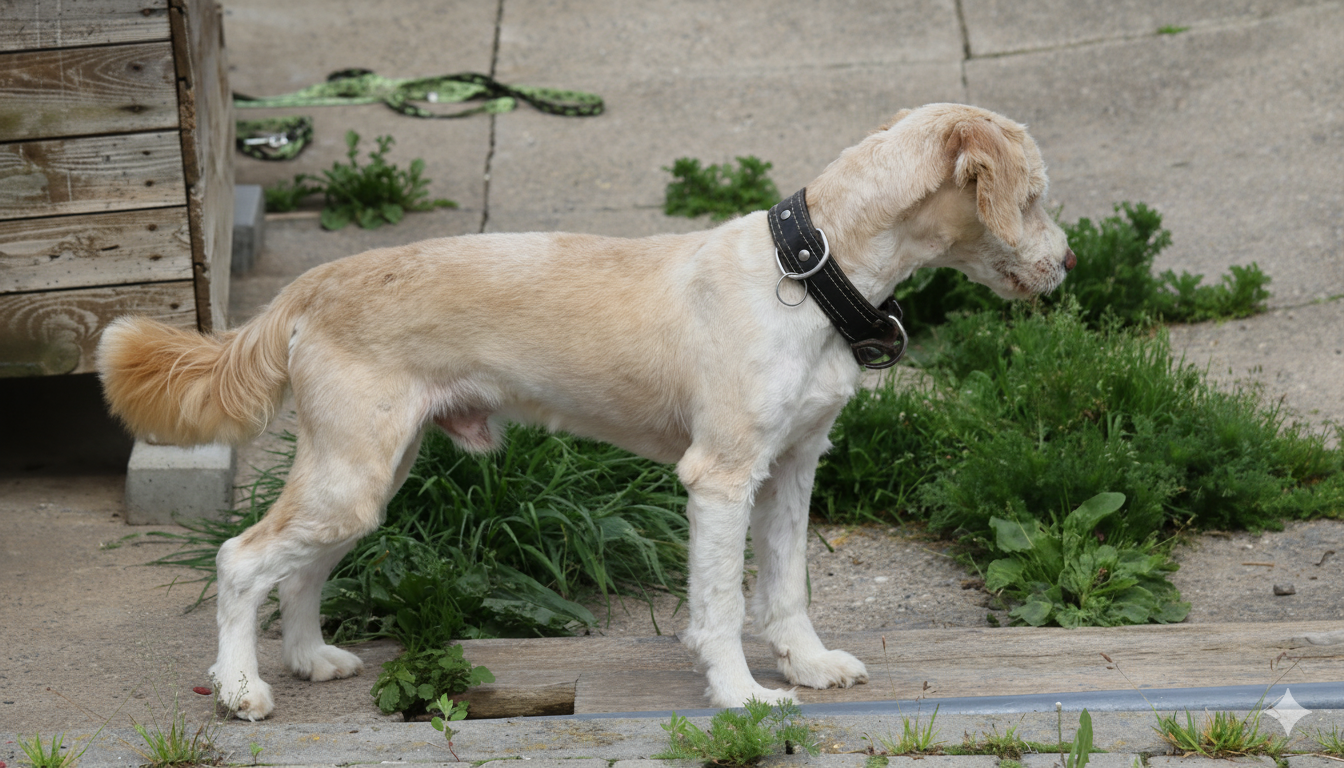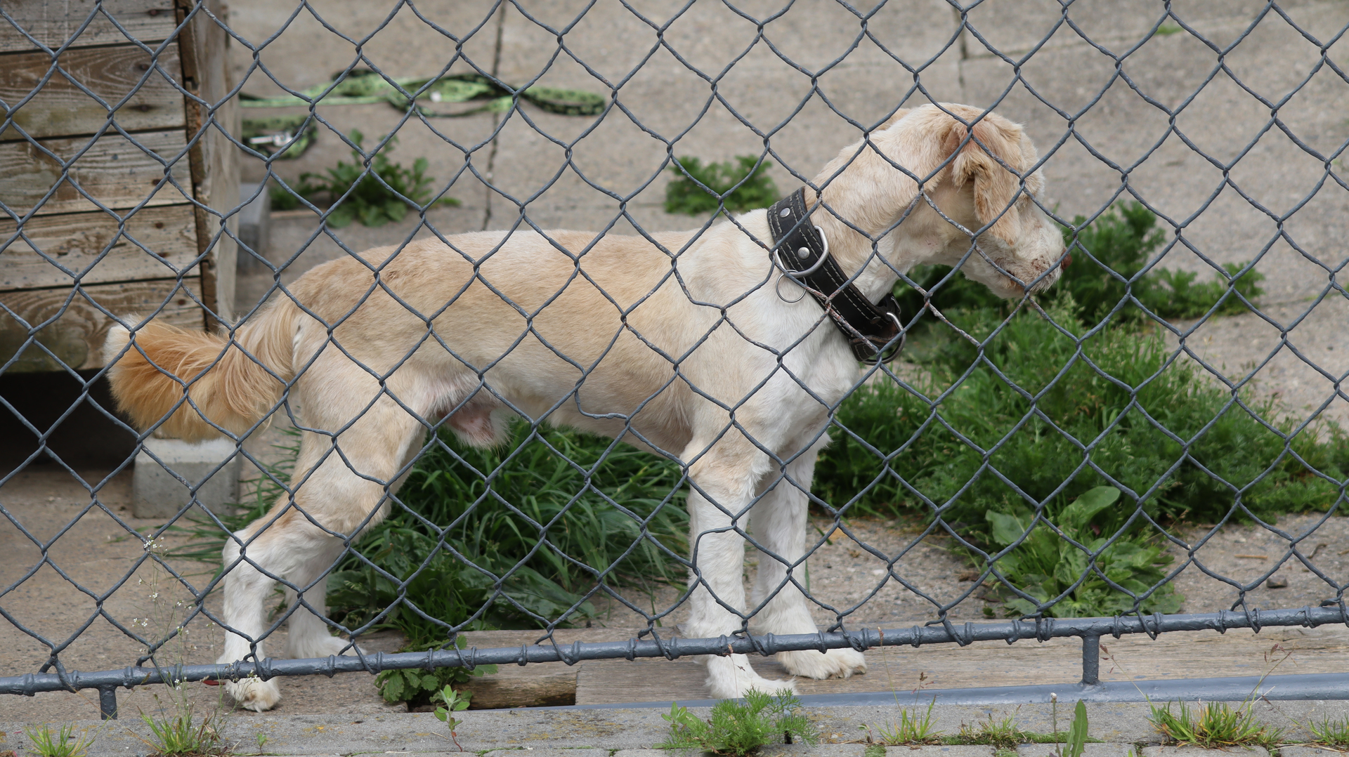 Behind the wire fence stands the dog Gery. He is photographed from the side. The dog is a village mixed breed of indeterminate race. The wire fence has been removed and does not obscure the view of the dog.