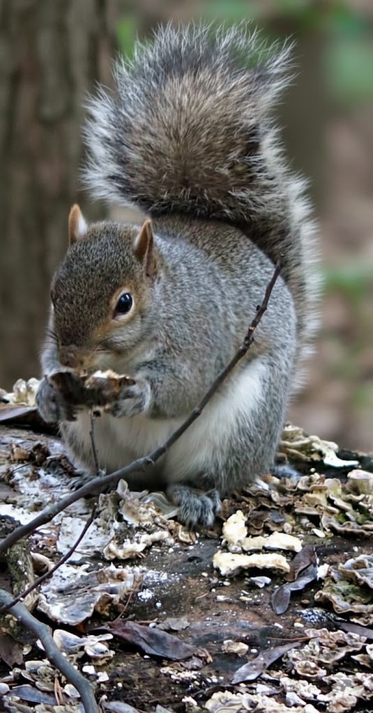 A grey squirrel on a stump eating mushrooms. His tail is held above him. The wire mesh pattern behind him is removed without losing the beautiful fur detail in the tail or the tree bark in the backdrop