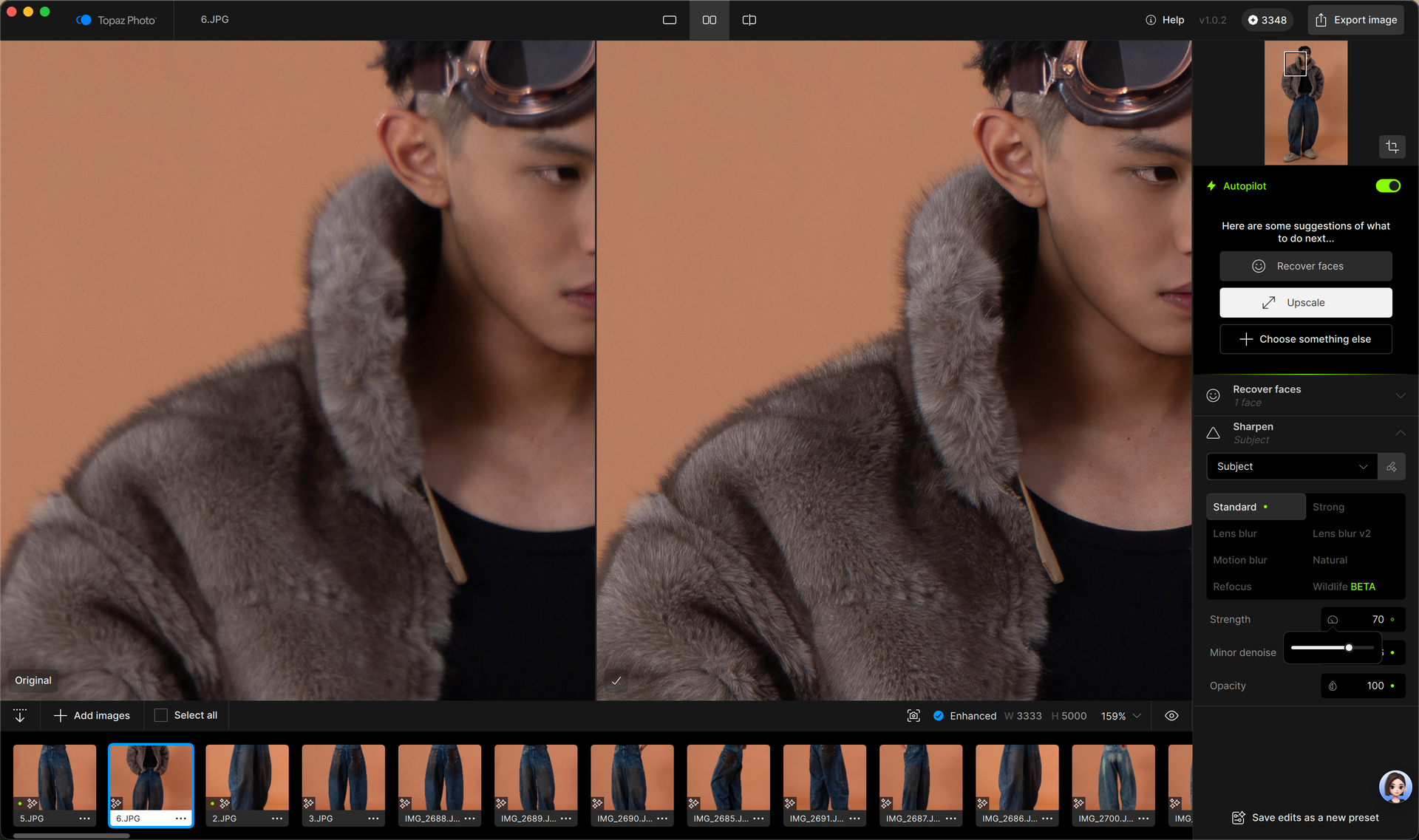 But I just discovered today that with the new wildlife model after the update, I feel this is finally the best model for realistic photos. I want to give all the credit and recognition to this model. Not only does the texture under out-of-focus situations get naturally sharpened and clarity restored, but photos that are already sufficiently sharp are further enhanced with texture and quality. I just didn’t expect why this excellent model took so long to arrive. lol, well done TopazI am a photographer and retoucher specializing in fashion apparel photography, and I have been using your company’s products for the past two years.