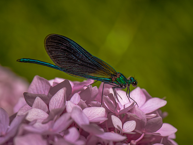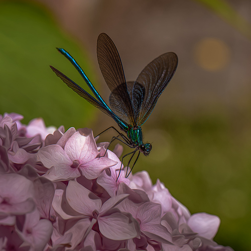 Caught this damselfly dancing around the hydrangeas. Topaz Studio.