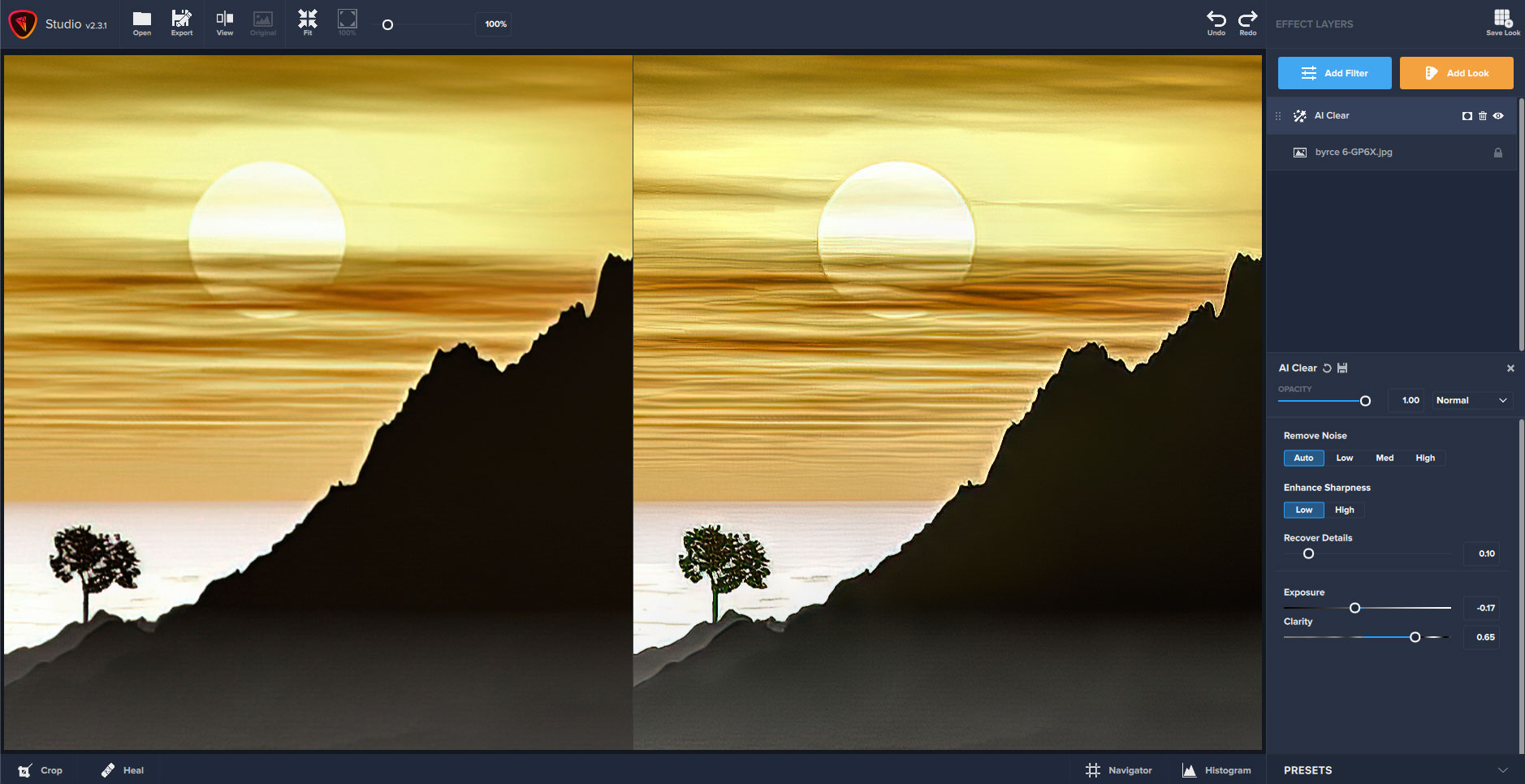 AI Clear has been a brilliant filter from the get-go and I too often use it in combination with Gpxl. I find it does work differently in Topaz Studio 2 than it does in DeNoise. In fact IMHO it belongs in SharpenAI too.