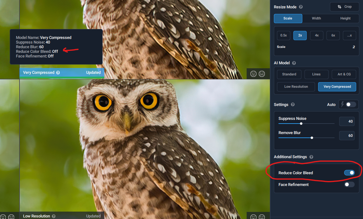 Topaz should have fixed the info call out on this 5.6.1 update. I mentioned it previously and the call out does not show the correct info for Face Refine and Color Bleed settings. I finally found a way to capture this below. Only the setting for color bleed was on at the time.