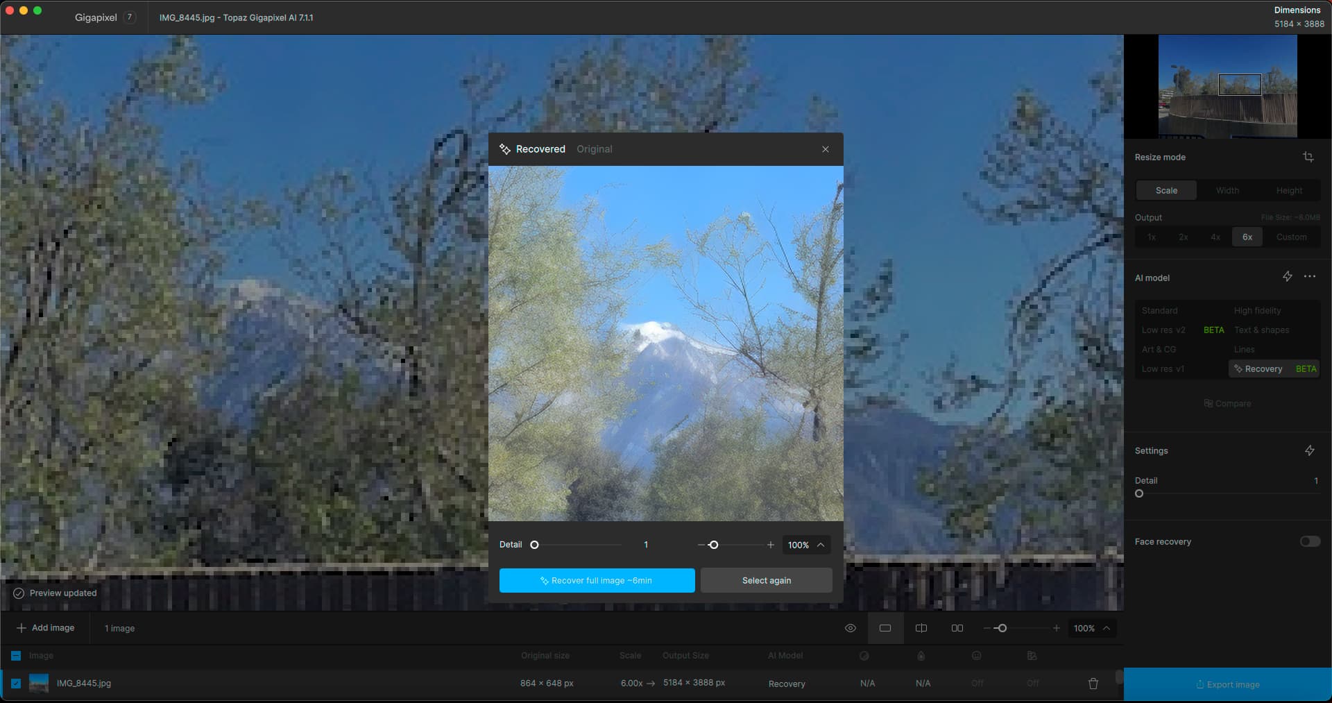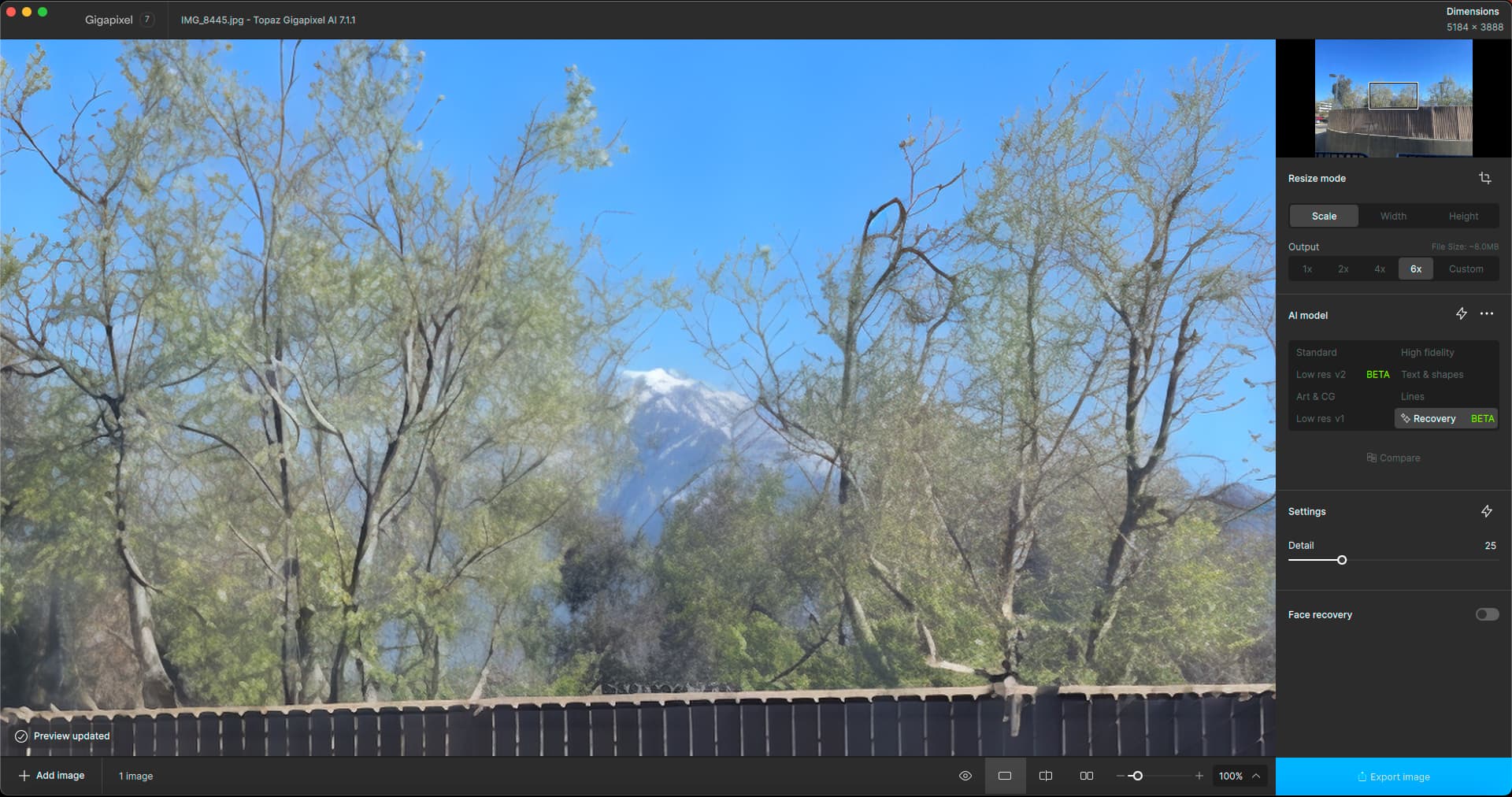 Wait: I thought this was going to be a 6X upscale of my crop but the export shows a smaller export size… Did it already get upscaled? The dimensions at the bottom of the GUI shows one thing and the export dialog another…
