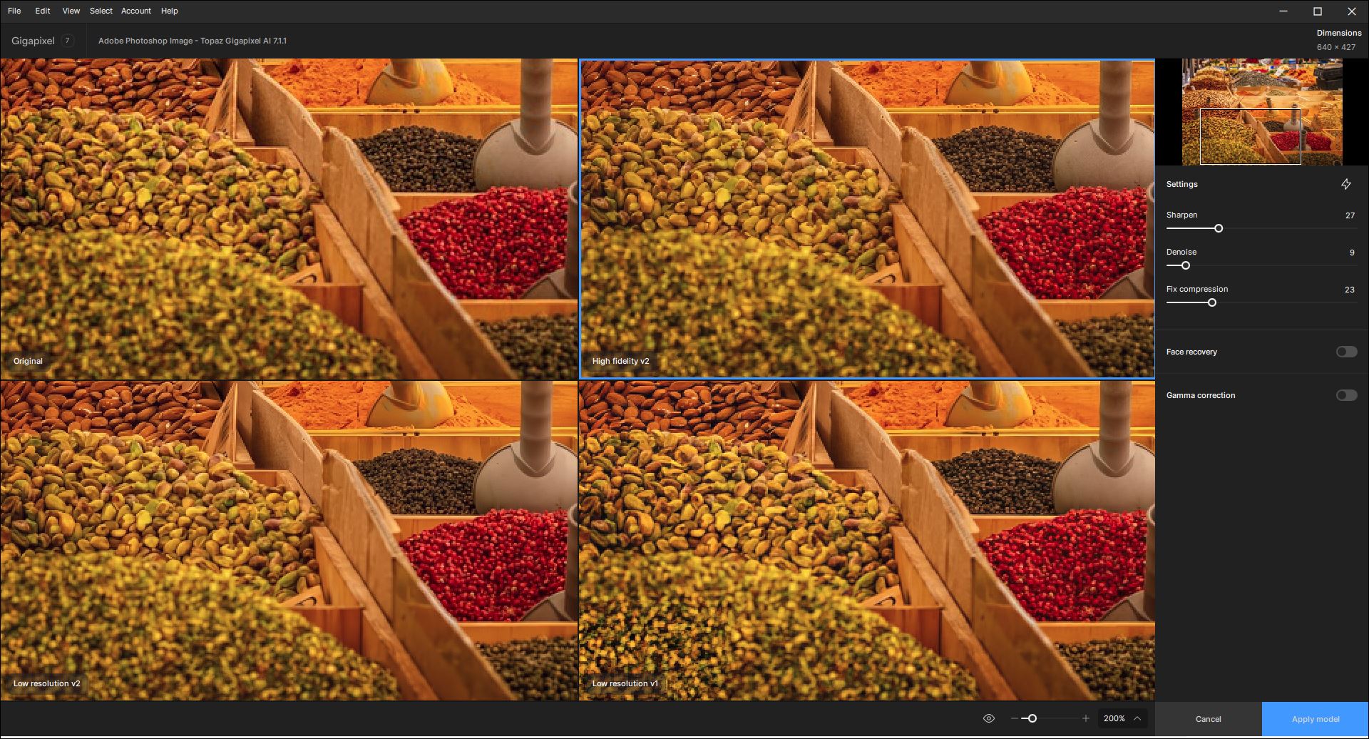I do have a Devs question: What is the value-add of Low Res v2 vs. Hi Fi v.2? I’m not (at least in 1st test image) seeing any re: details recovered, intensity of the settings, etc. and I’d be more inclined to use Hi Fi for its implications of keeping a photo looking enhanced but still photographic. Plus, the Low Res v2 (again, at least on 1st test image) seemed to produce jaggier edges on objects in the scene (to my eyes). I can see the model settings diff. b/wn Low Res v1 and v2 in terms of the add’l. slider for compression details, but that’s not what I’m asking about. Thx!