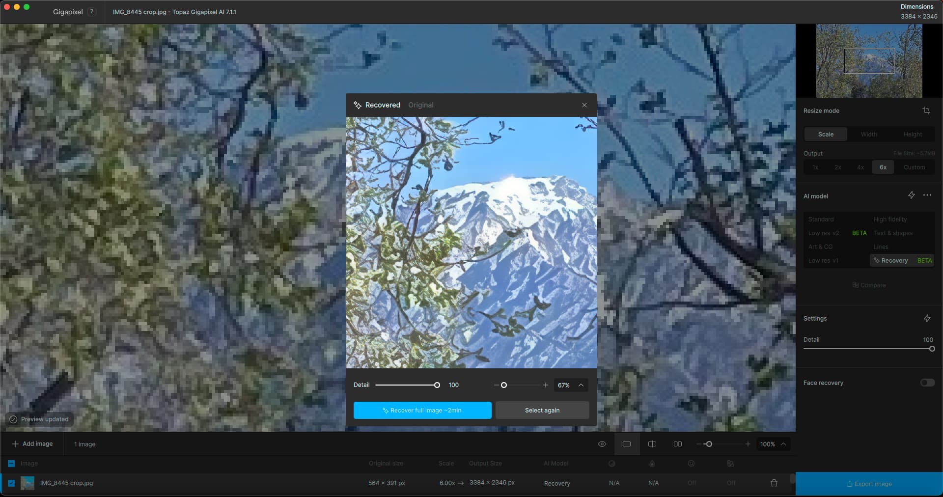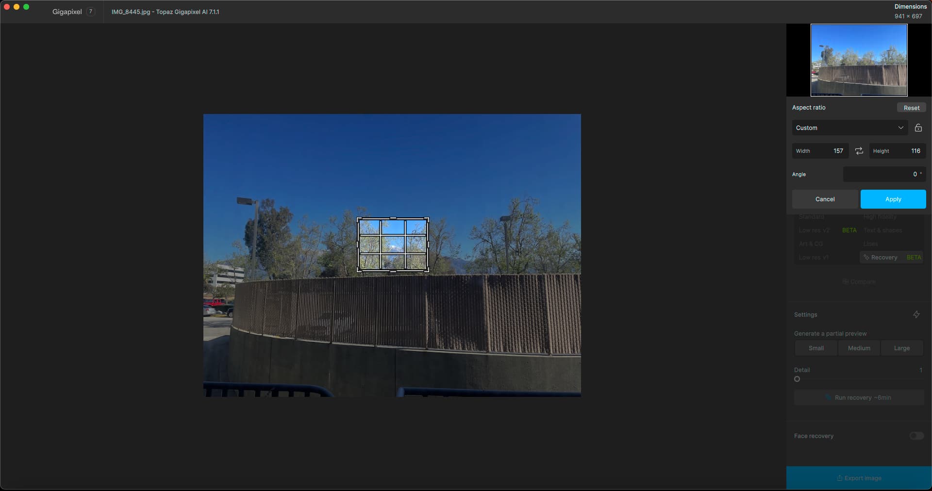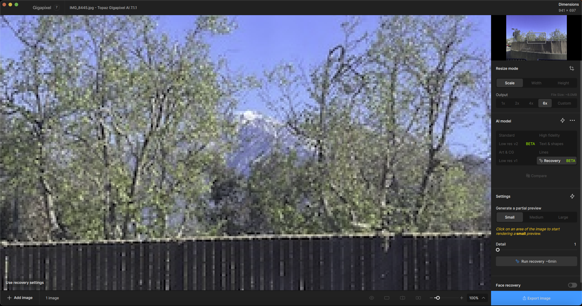 GP warned me that to process the whole image would take 6 minutes, and since I don’t care about the whole photo, I decided to crop it before recovering:
