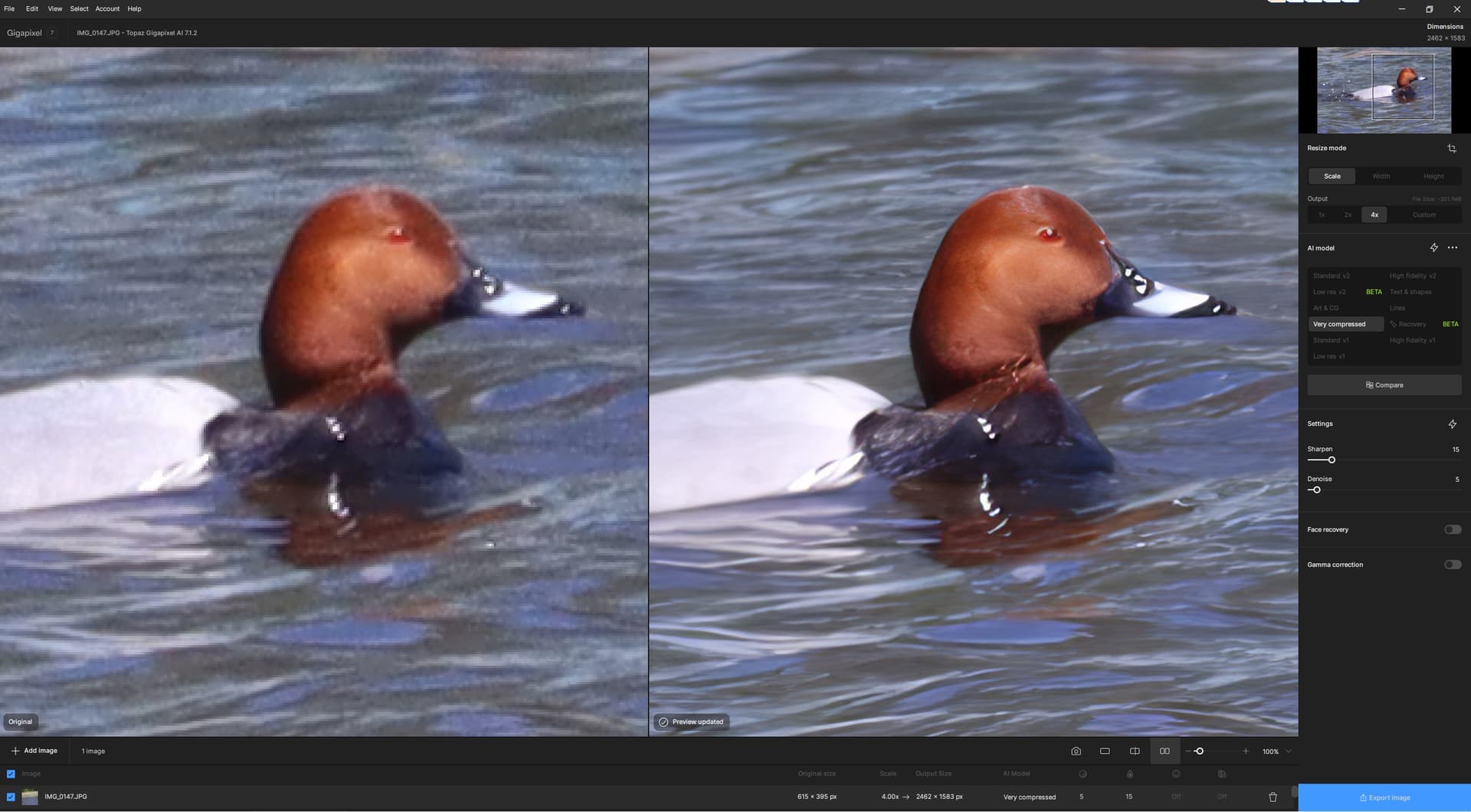 For me the latest Gigapixel 7.1.2 is the best so I’d say it’s moving in the right direction. Which made me very happy. On the subject of “wild ducks”, where last year (and before) I didn’t have great results because the ducks were always far away and tiny, I tried different models. Nothing particularly interesting (but for me, yes). This year the red-headed ducks (Pochard, or Aythia Ferina) appeared, so I tried it (plus with a better camera, Canon EOS 100). The default resolution of the photos is 6000 x 3368 pixels, but after cropping the duck, only 615 x 395 remained. I used Gigapixel with 4x magnification (the result was 2462 x 1588) and looked for a suitable model. But even Low res (both versions) did not give good results. Surprisingly, the Very compressed model performed exceptionally well again. I am attaching a printscreen for illustration. I’m not sure about some of the details in the photo, but I’m very happy to be able to get usable images for my enjoyment. I look forward to the next installment of the Gigapixel series!