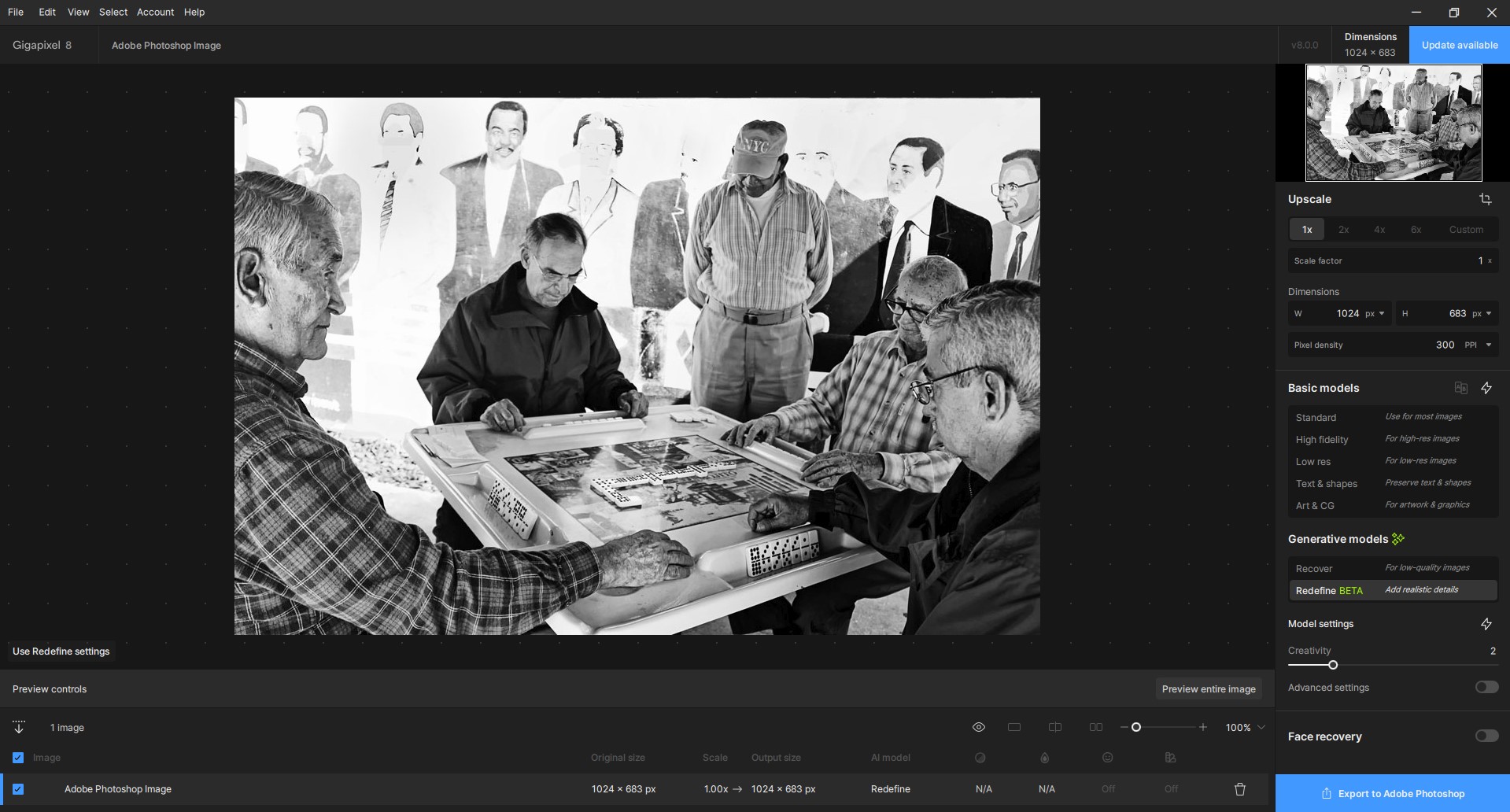 Image below is after PAI sharpening (only to the real subjects, not the mural), GAI Redefine (using description to populate some of the blown out figures on the mural behind the Cuban men playing dominoes), some Face Recovery. Had to use “Cloud” - no way my PC (that isn’t low end) could handle the processing… The processing (Creativity level 2) did weird things to the real men’s faces and mutilated the dominoes (which I didn’t realize until just now…).
