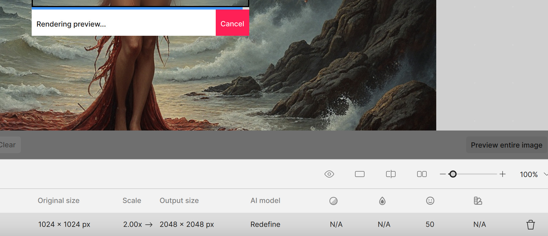 AI renders enlarged 6X, with low and high Redefine Creativity, shown here about 25%. At lower values, Creativity retains the look of the originals but with improved detail, while at high values, our familiar friend returns!