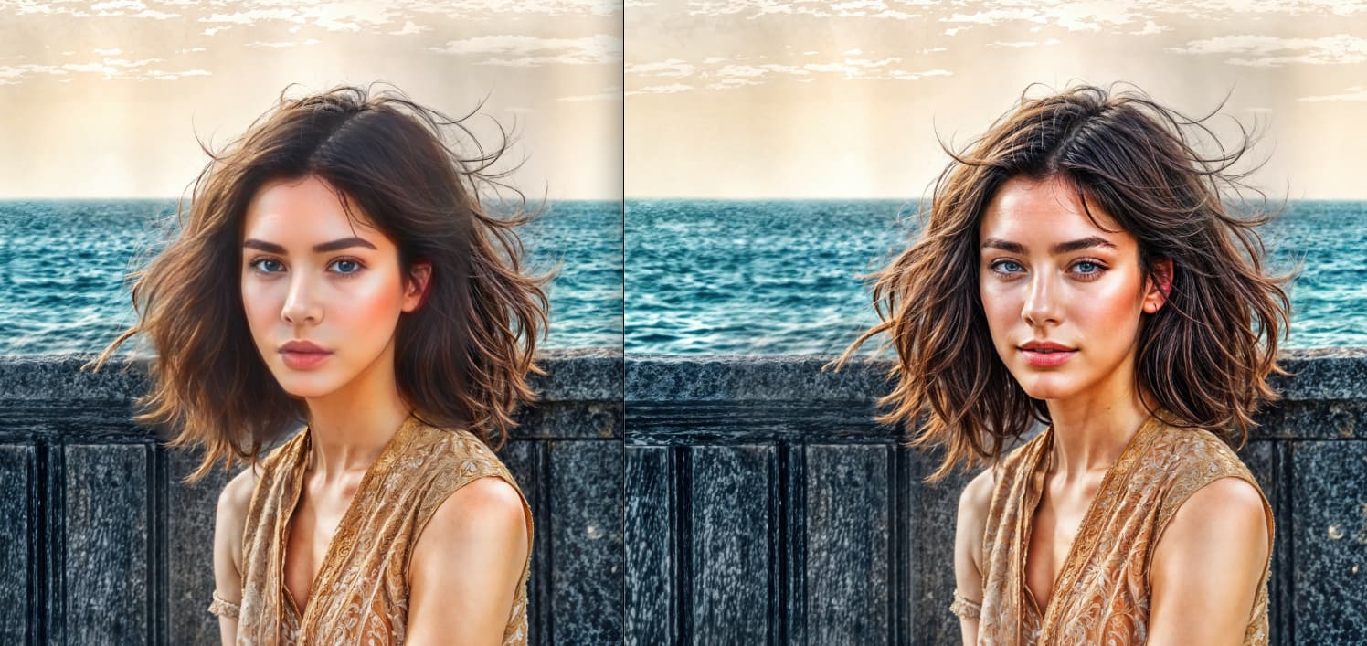 Face Recovery was turned on inadvertently for the example at left, which retained more of the original art in the face even at a high Creativity setting but left the “face square” as a result of the auto face mask. Same high settings at right without Face Recovery (hello TG!).