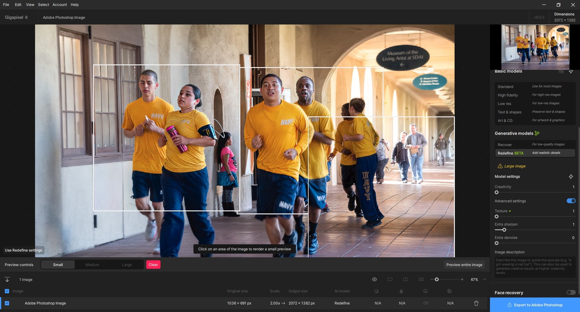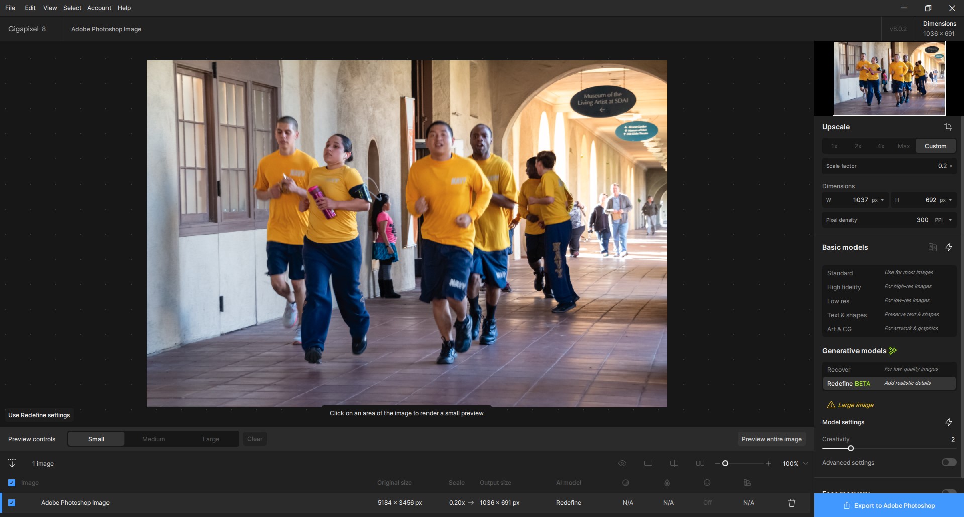 Part 2-B: Tried the reDefine Model previews for my Photo (noodled around with different Creative, Texture, More Sharpening settings - all under 2, but set at varying levels among them, not all at 2). I believe the Preview Box that I felt did the best job without reinventing people was Creative = 1, Texture = 1, Sharper = 1. I only worked with the Preview Boxes (b/c my attitude is, that’s what the final should look like & I didn’t want to waste my credits for this test of an image I can’t use for anything else but that has a mix of people, signage with text, geometric shapes in architectural details, etc.). Impressions: the reDefine Model previews seemed to significantly sharpen the test image but in trying to rework the runners faces (I didn’t use Face Recovery at all) it did slightly modify some of their facial elements - notably mouths, teeth, eyes. As I suggested in the previous release, we need finer interim gradations of settings for the non-Basic models; if they’ll be an ongoing feature.