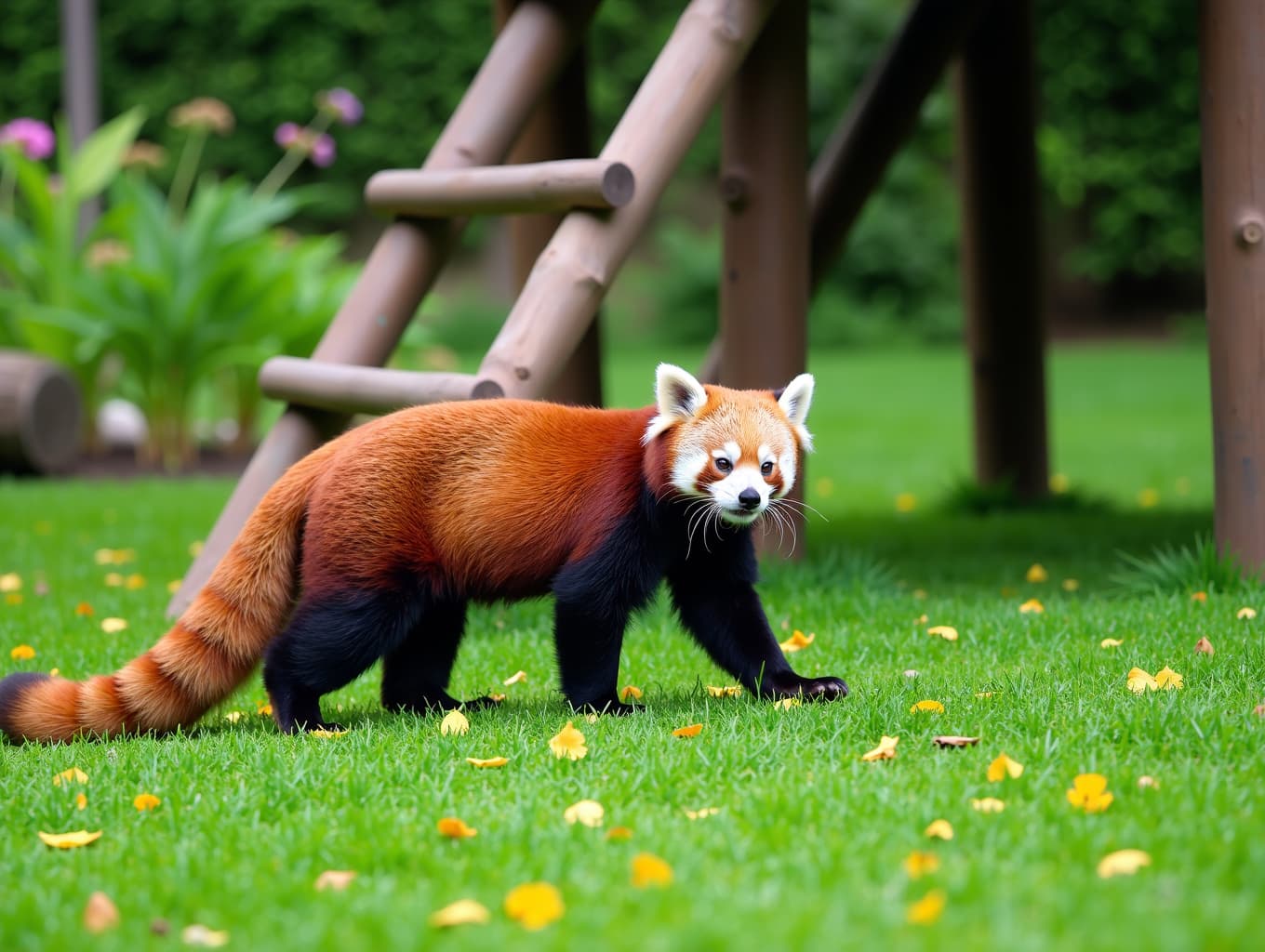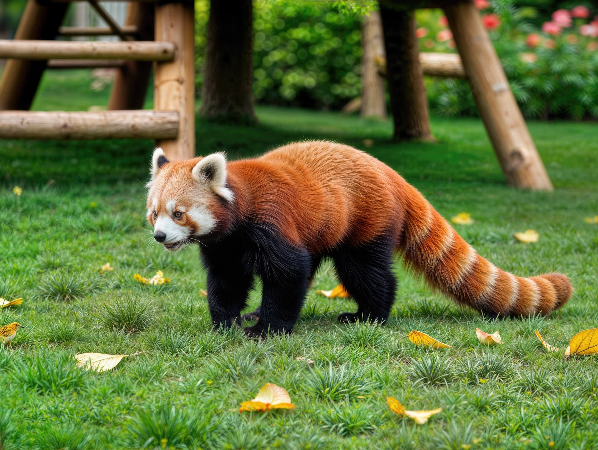 “A red panda walking on all fours in a grassy area with a wooden structure in the background. The structure is made of wooden sticks and has a ladder leading up to it. The ground is covered in green grass with yellow leaves scattered around. The panda has a reddish-brown fur with white markings on its face and tail. The background shows a lush garden with various plants and flowers. The image is taken from a low angle, looking up at the panda.”