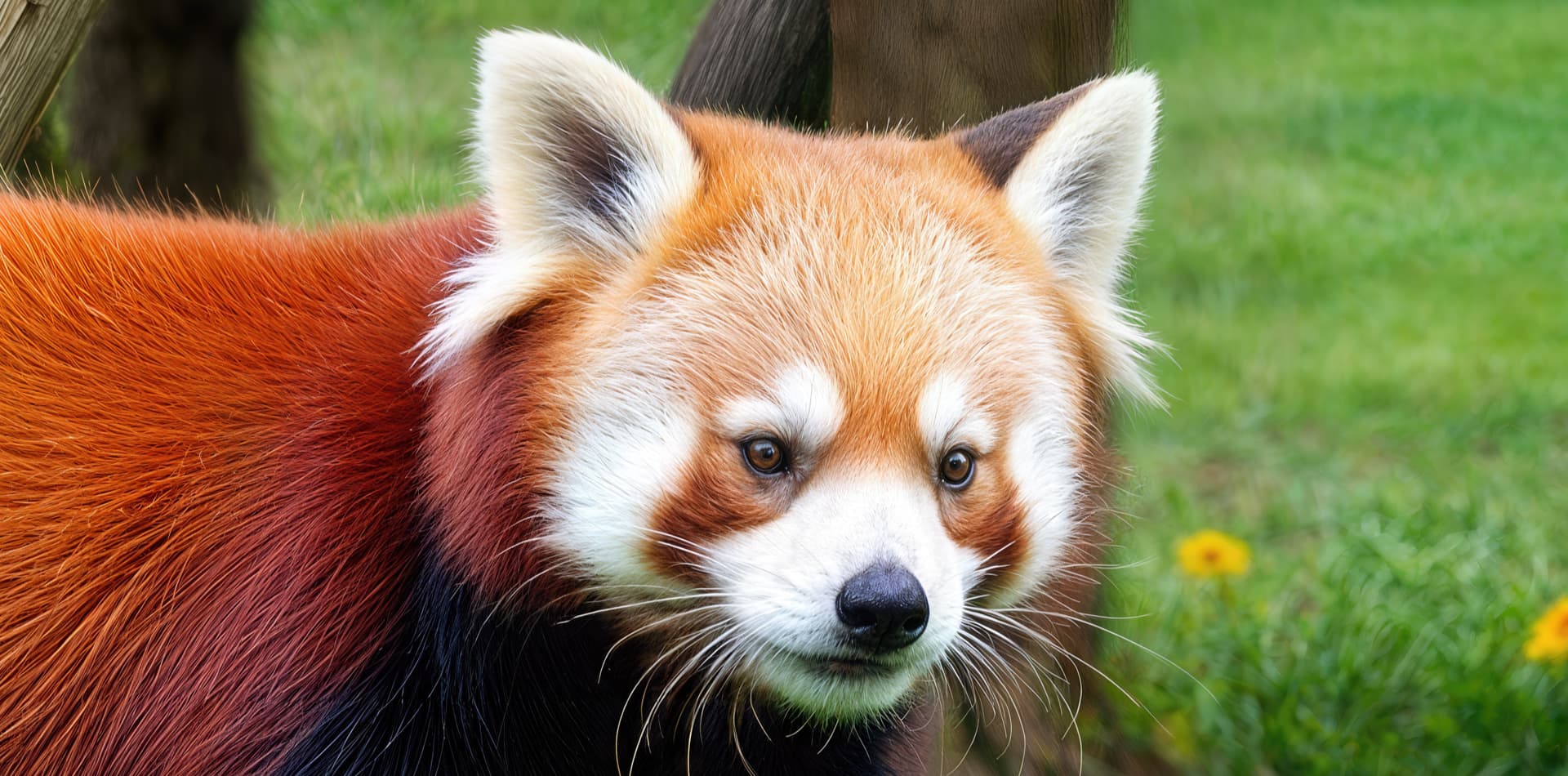 “A photograph of a red panda walking on all fours in a grassy area with a wooden structure in the background. The panda has a reddish-brown coat with white markings on its face and tail. The structure is made of wooden sticks and has a ladder leading up to it. The ground is covered in green grass with yellow leaves scattered around. The background features a lush garden with various plants and flowers. The lighting is natural and natural, with a soft focus on the panda’s fur.”