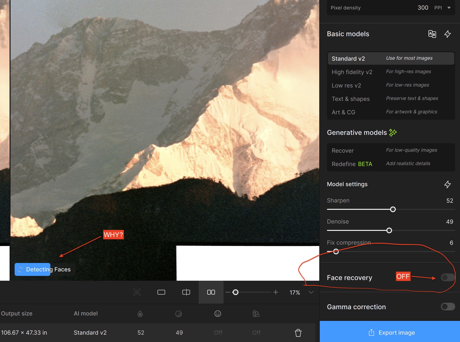 When GPAI 8.1.1 loads the image, it immediately begins “detecting faces”, which burns up nearly 20 minutes, depending on how much of the image I’m showing. Face Recovery is switched off. Really, it’s OFF. Screenshot attached.