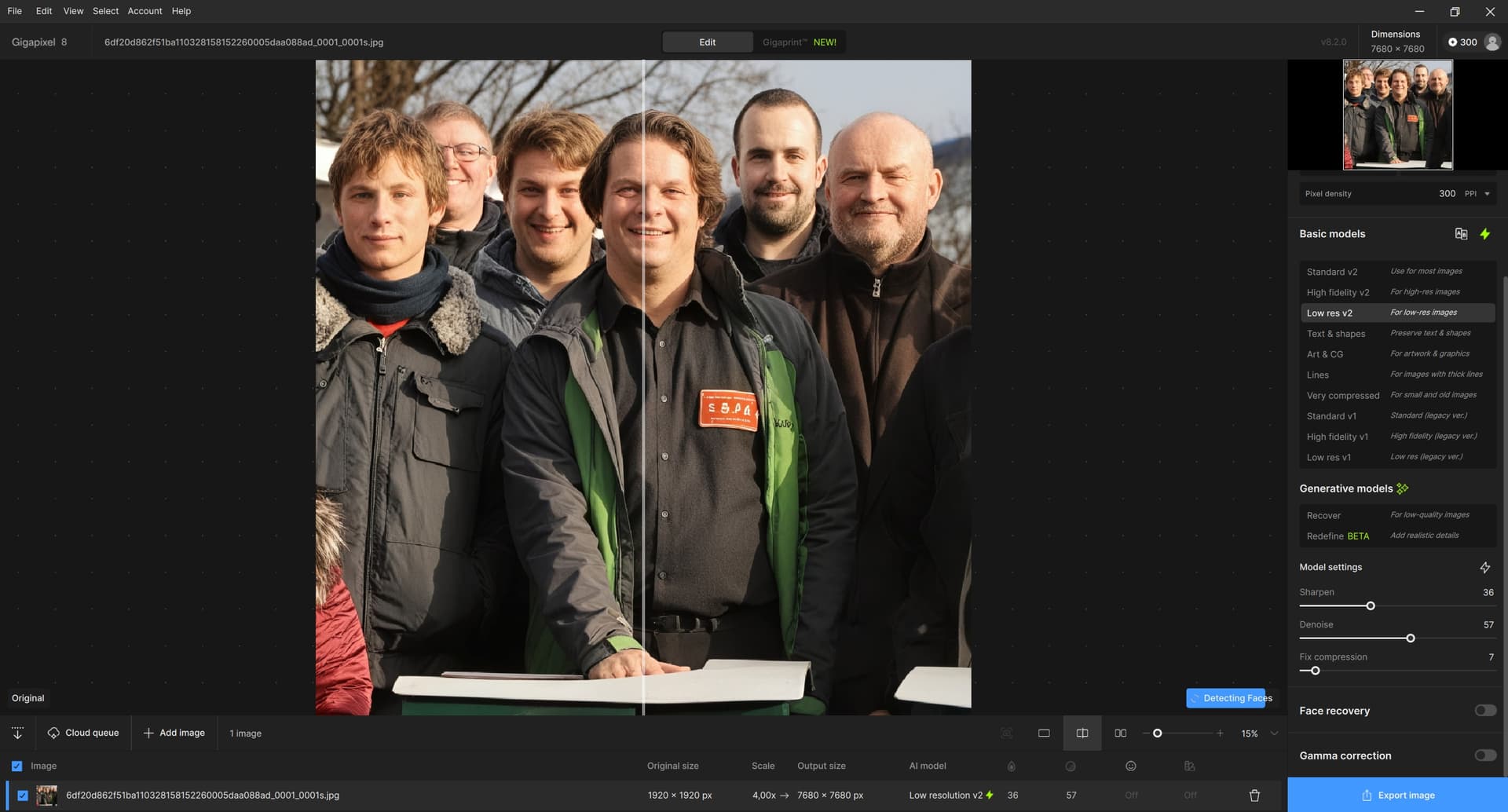 To be honest, it only flashes for a moment for me too, so I didn’t know about it until now, when I read your discussion with @10061996. Apparently it’s more (or longer) noticeable in larger images. I’d agree with @10061996 that Gigapixel wouldn’t have to stubbornly stick to finding faces (after all, it has its Redefine with Creativity 6 and Texture 5 supported by prompt for that; Topaz Girl is always revealed everywhere in the end!