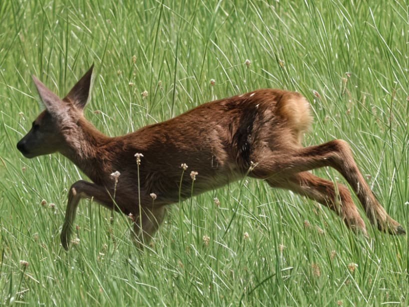 The entire image captures a snapshot of wildlife, highlighting the grace and liveliness of the roe deer in its natural habitat. The slight motion blur in the grass enhances the feeling of speed.ā