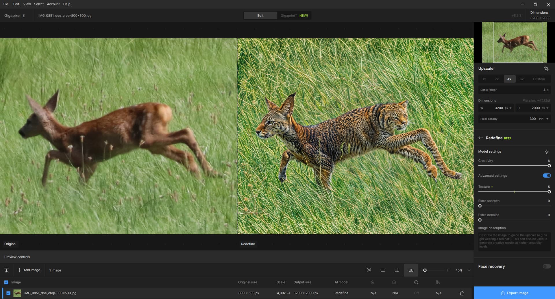 By the way, first try redefine without scaling and then from the resulting image, scale with Redefine or recovery. Normally, the result should be better.