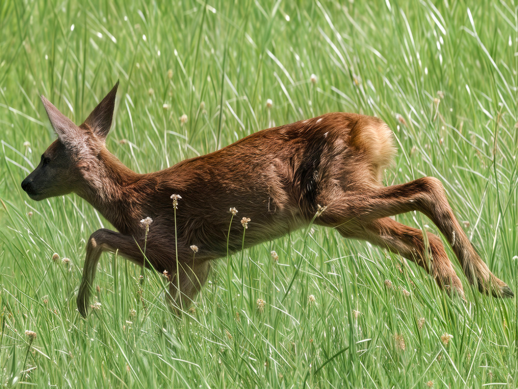 āThe image shows a roe deer (likely a female or a juvenile, as it has no visible antlers) in full motion, leaping or running through a field of tall green grass.