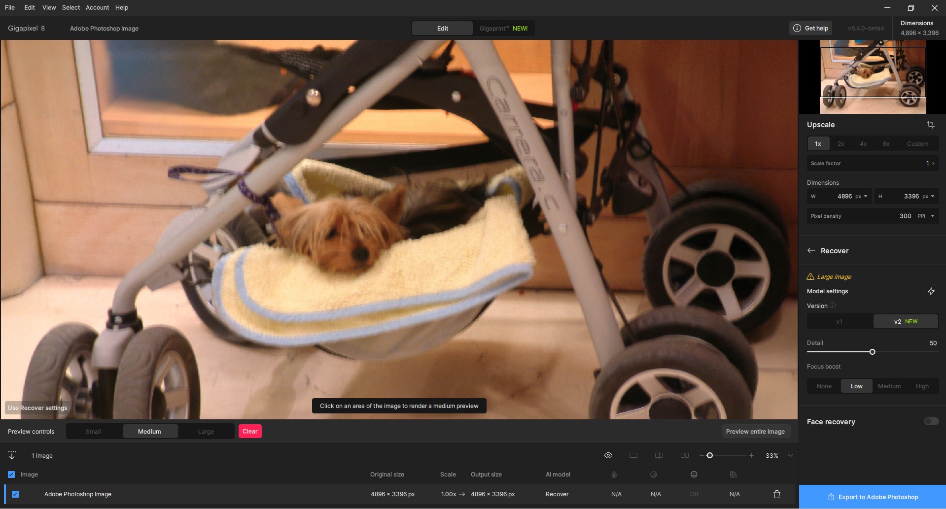 And although Gigapixel is in plugin or standalone mode, the speed is very slow with redefine when Photoshop is open. If redefine works (even just with a preview area) and I close Photoshop or open it if it’s not open, it’s a black screen with a Gigapixel rendering error and it closes itself. The worst thing is that I get the same thing when I open Discord while Redefine is running. But Discord isn’t resource-hungry. When I use Redefine as a Lightroom plugin, I have to close Lightroom otherwise the rendering takes 2 or 3 times longer.