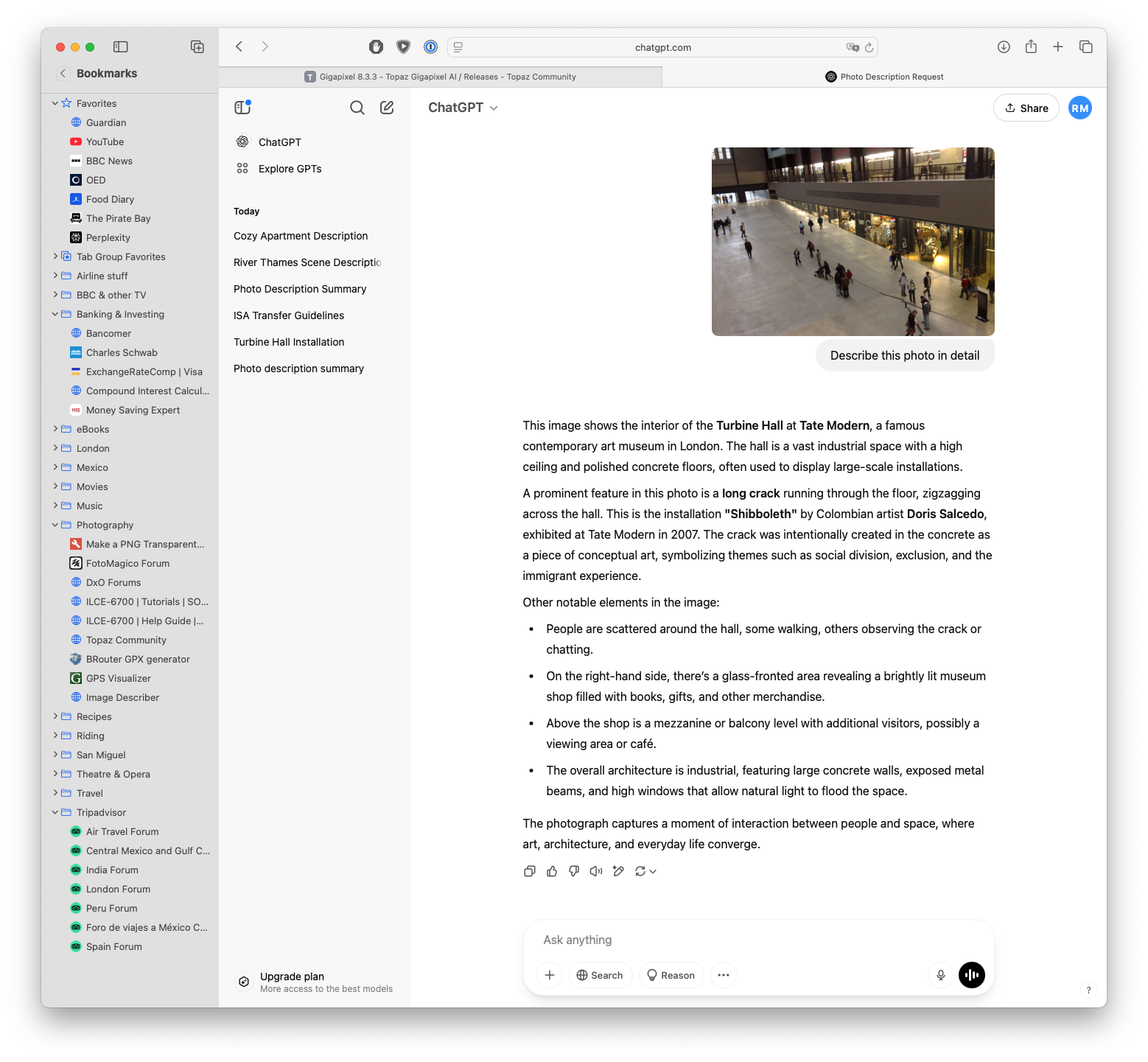 Always worth trying something new! I uploaded an image of the Turbine Hall at Tate Modern taken in 2007. It merely said it was a large urban space filled with people walking in different directions. Chat GPT identified it as the Turbine Hall and even gave details of the art installation at that time. So it’s Chat GPT for me!