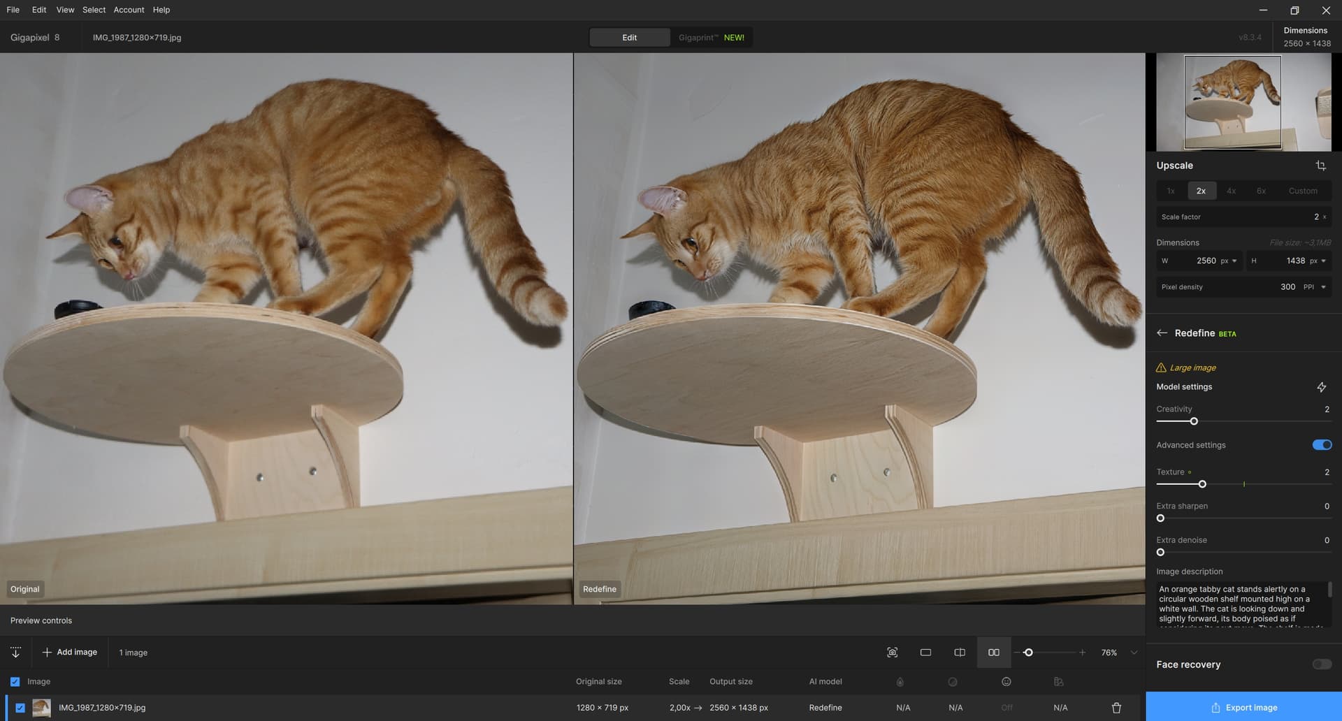 Today I played around with a photo of my cat that stole my camera lens cap and took it to his observation base above the door, where he studied it (it has already been returned to me). I’m attaching the prompt from Gemini and the result of Redefine with C=2, T=2, and U=2 (for T=3 artifacts have already started to appear too much, as well as for Upscale > 2, quite an unpleasant thing). It’s still not great, the wall color turned gray, some artifacts appeared. It would be nice to be able to select/mask only some parts of the photo (the cat, the shelves), which is not possible. But I didn’t want to do any magic with layers, etc., the photo is not important. And the Gemini prompt, which had a favorable result especially on the cat (fur, hair in the ears, whiskers):