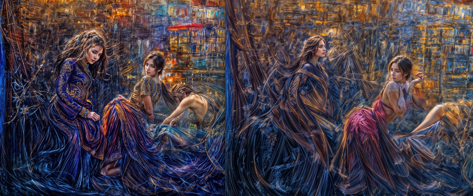 Here is my original 2022 WOMBO abstract render alongside 4X then 6X Redefines, Creativity=6, Texture=3, followed by 100% crop views of the girl at lower right for comparison.