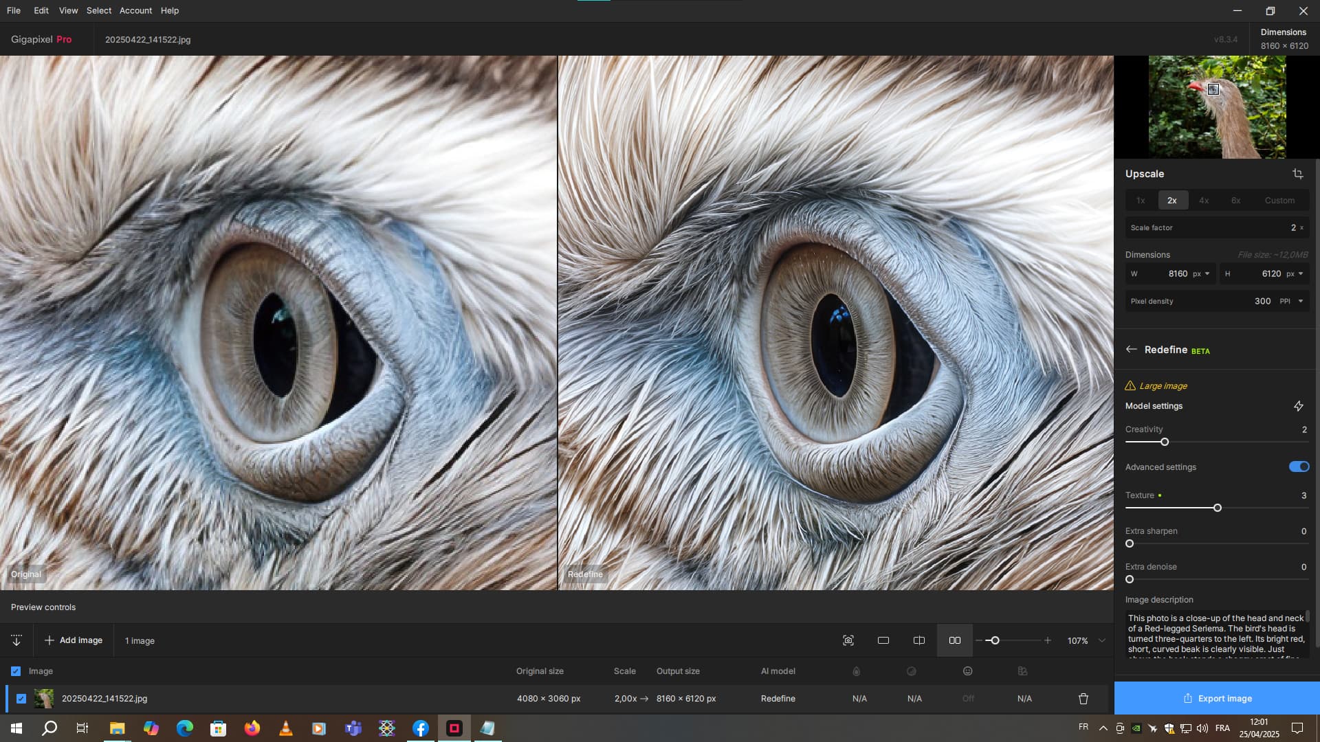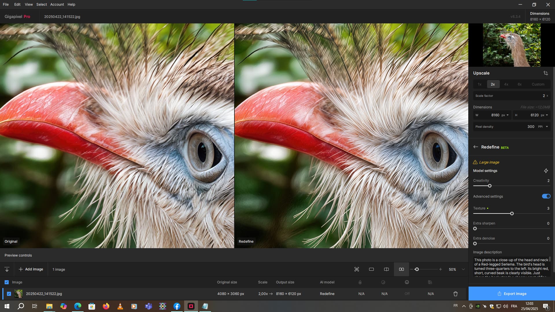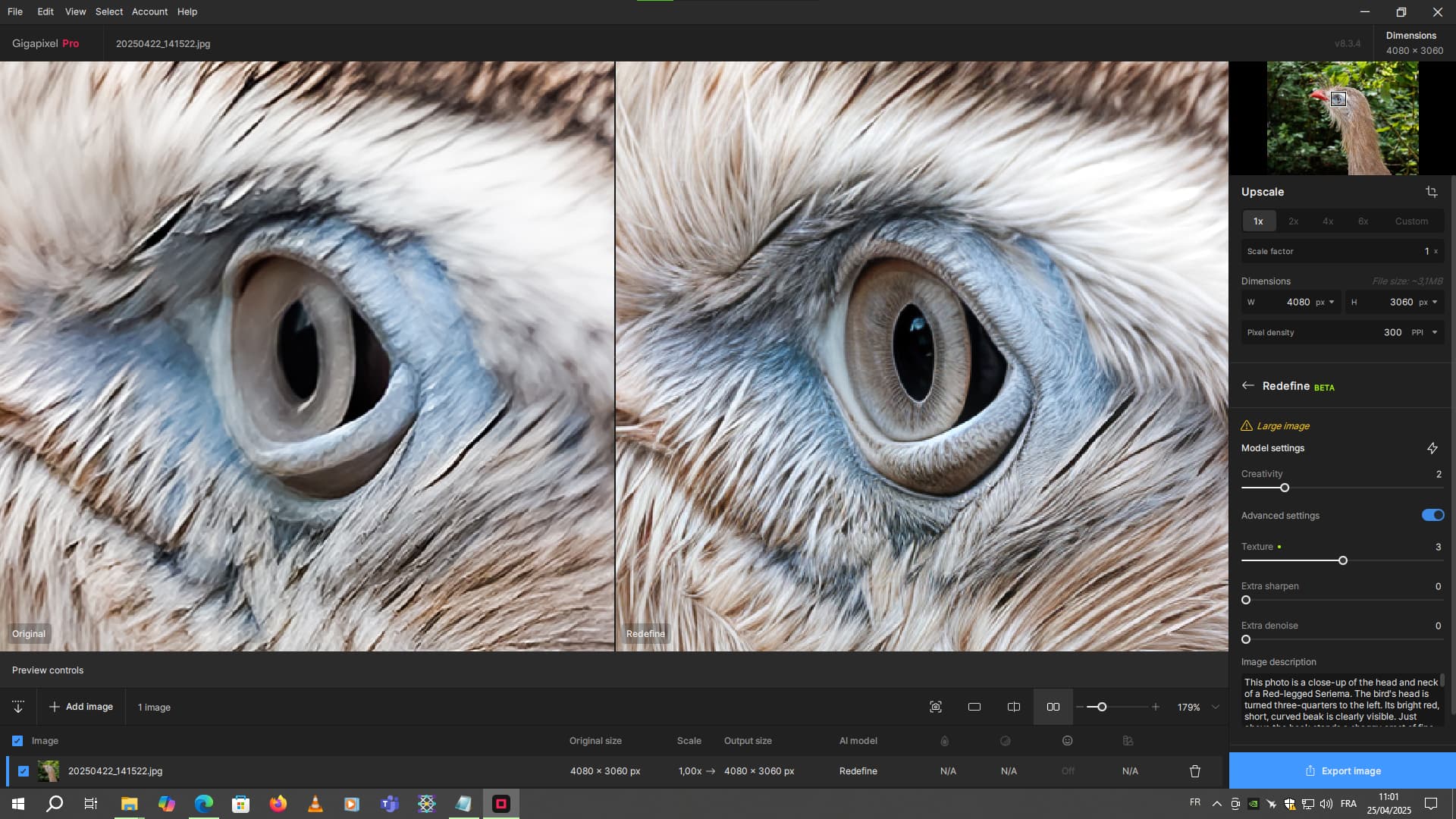 Sometimes on certain 50-megapixel images, with x1 refinement, depending on the distance from the main subject, it can add good detail. But sometimes some of the details aren’t so good, so what I do is to reduce the resolution by 2 and redefine at x1. And that’s better. Then I do a x2 scaling again.