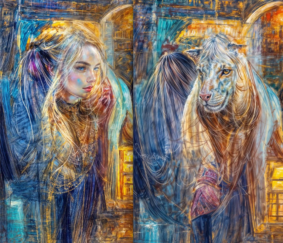 Well, the right side of the top picture (6x), admirable. Something like a cross between a horse and a feline ? Great AI fantasy. Of the bottom one, I like the one on the left (4x). But Redefine still can’t handle hands and especially fingers. It may be so for now, it’s still a beta version…