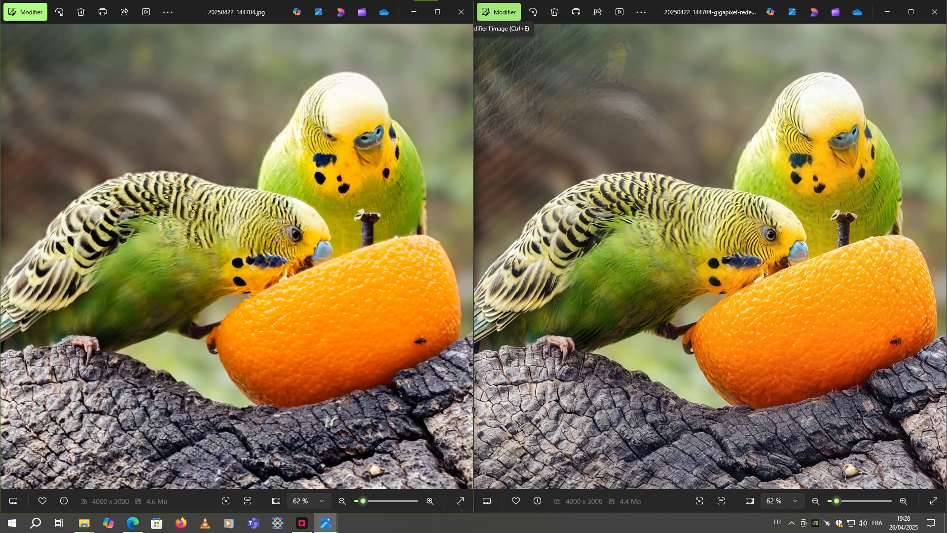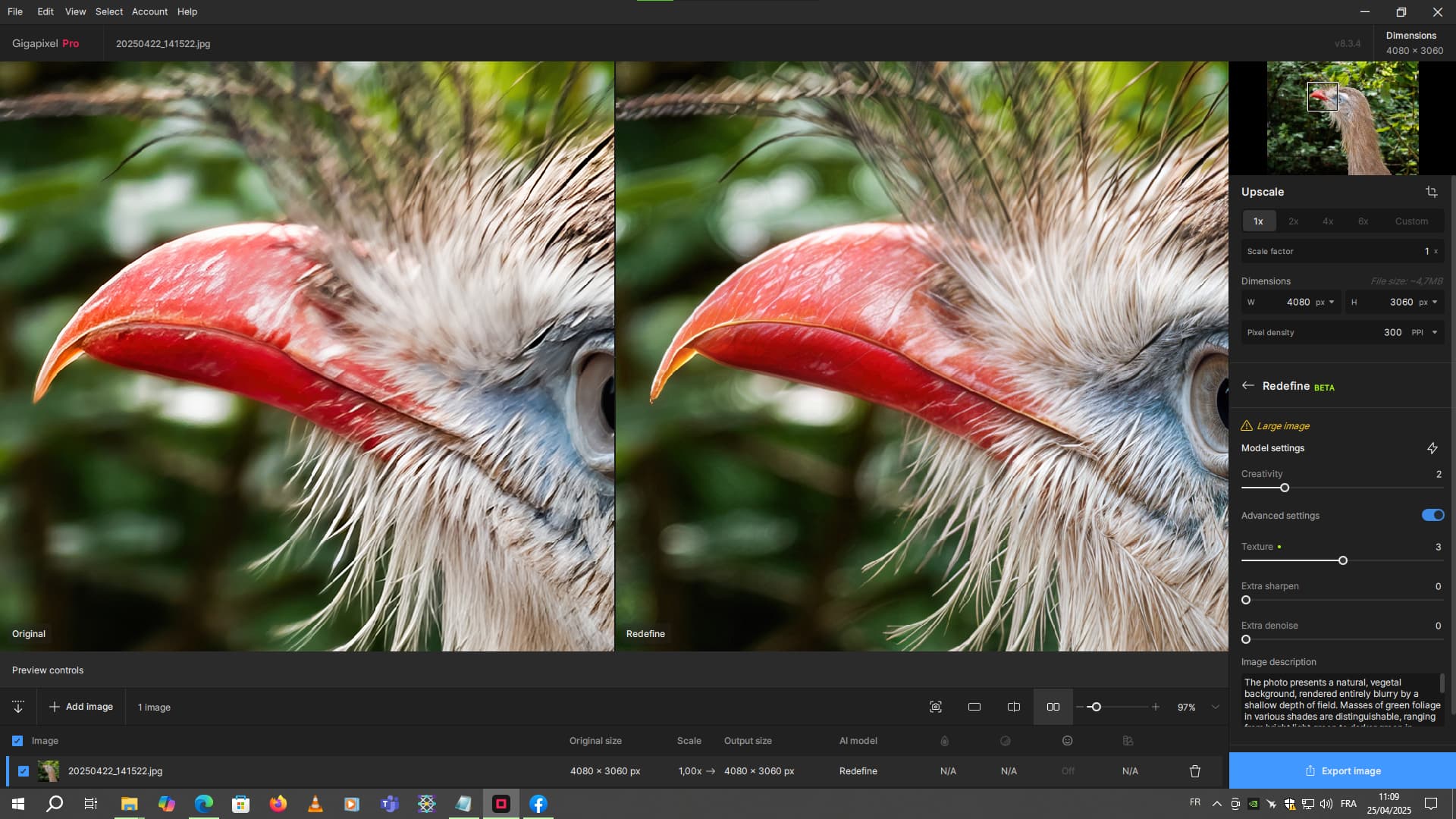 In this example, the photo is reduced by 2 to improve certain details. Then I’m going to upscale it by 2 again, using Hight Fidelity for example.