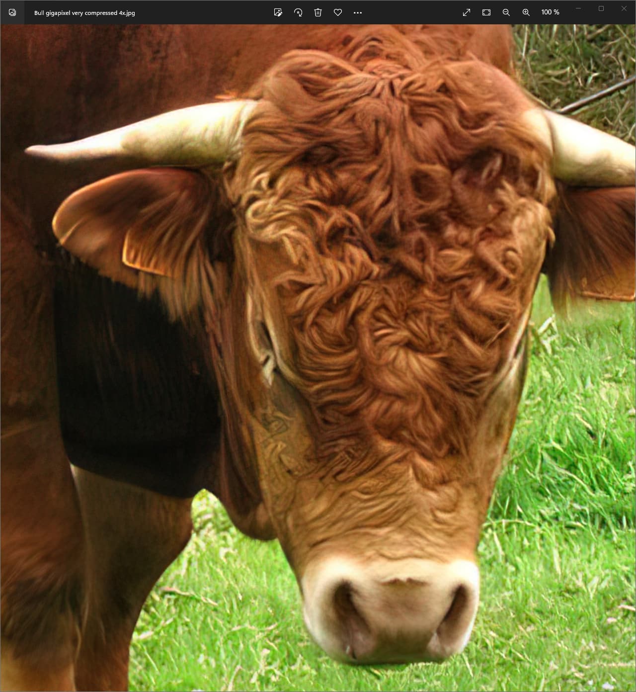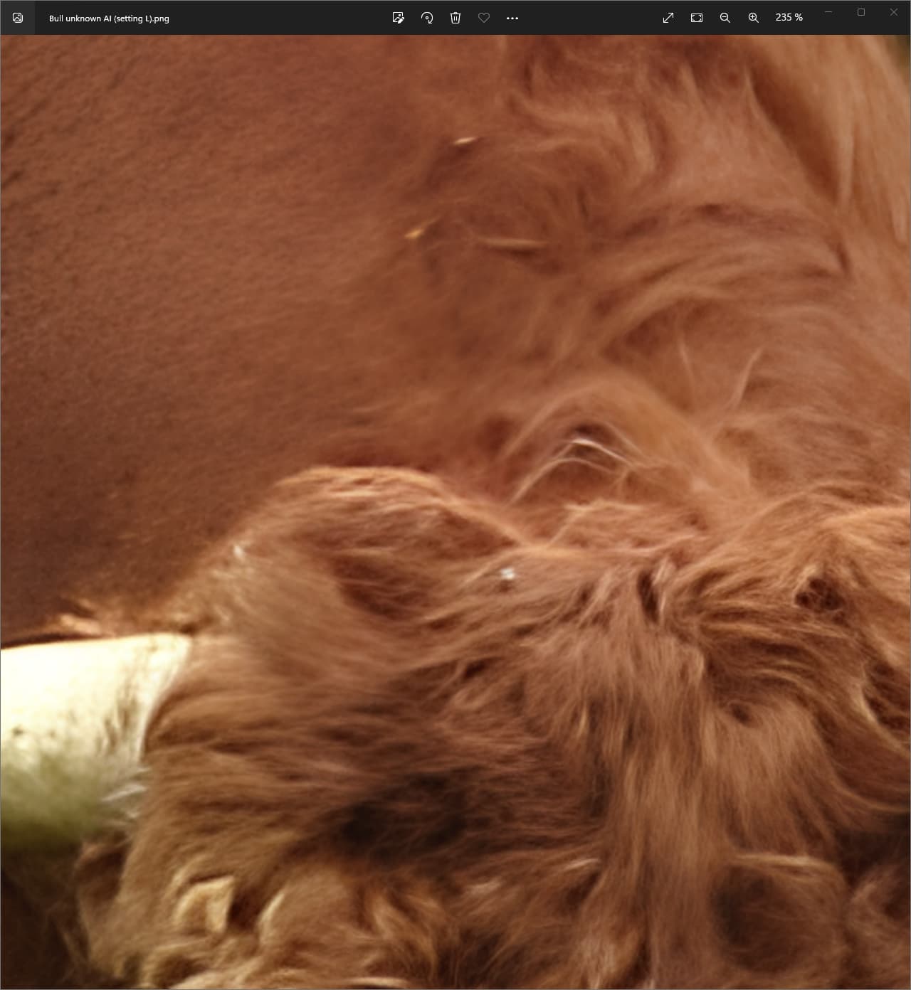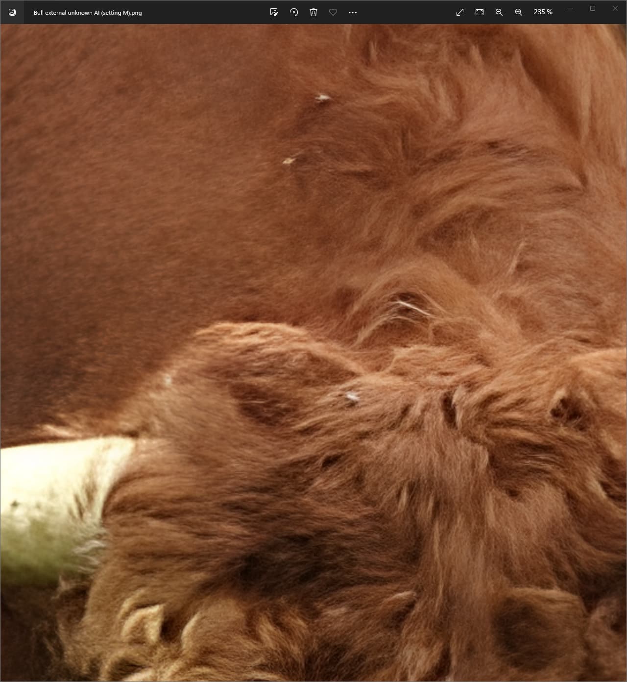 you didn’t noticed it but gigapixel is doing a much much better work on the grass and all the background. the “unknown AI” is removing a lot of details there. it’s working great while zooming, but by full comparaison, the fur is different, not only by colour but in the texture too. where i agree, is when zooming ! on the cow, on the last picture, the result is very impressive, but on overall with the background and grass, i prefer gigapixel. i’m really curious to know which new software it is.