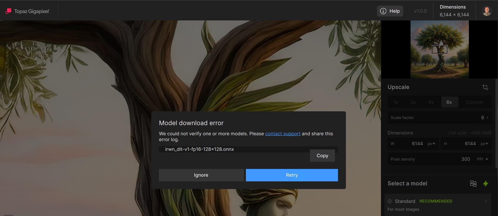 Some model files in Gigapixel AI are very large, and download errors may occur if your internet connection is unstable or your system security settings interfere with installation.